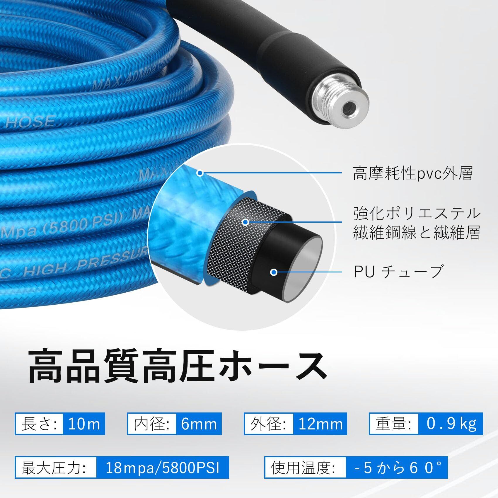 【改善②パイプをおしゃれにしてとともに高品質材料を採用】今度のケルヒャーパイプクリーニングホースは黄色いと青いパイプがあります。洗浄作業にもっと目立つになります。またケルヒャー配管洗浄ホースはPVC素材、表面は高品質ゴム、真ん中は鋼線と繊維でできた防爆層、内層はPU素材です。 圧力を落ない、ねじれにくい硬さを持ってる同時に自由に伸びる柔らかさもあります。最大18 MPaに耐える厚いポリエチレンを採用して、耐久性も強いです。また配管が詰まった時、業者を呼ばなくても自分でやれます!もっと経済的です!
