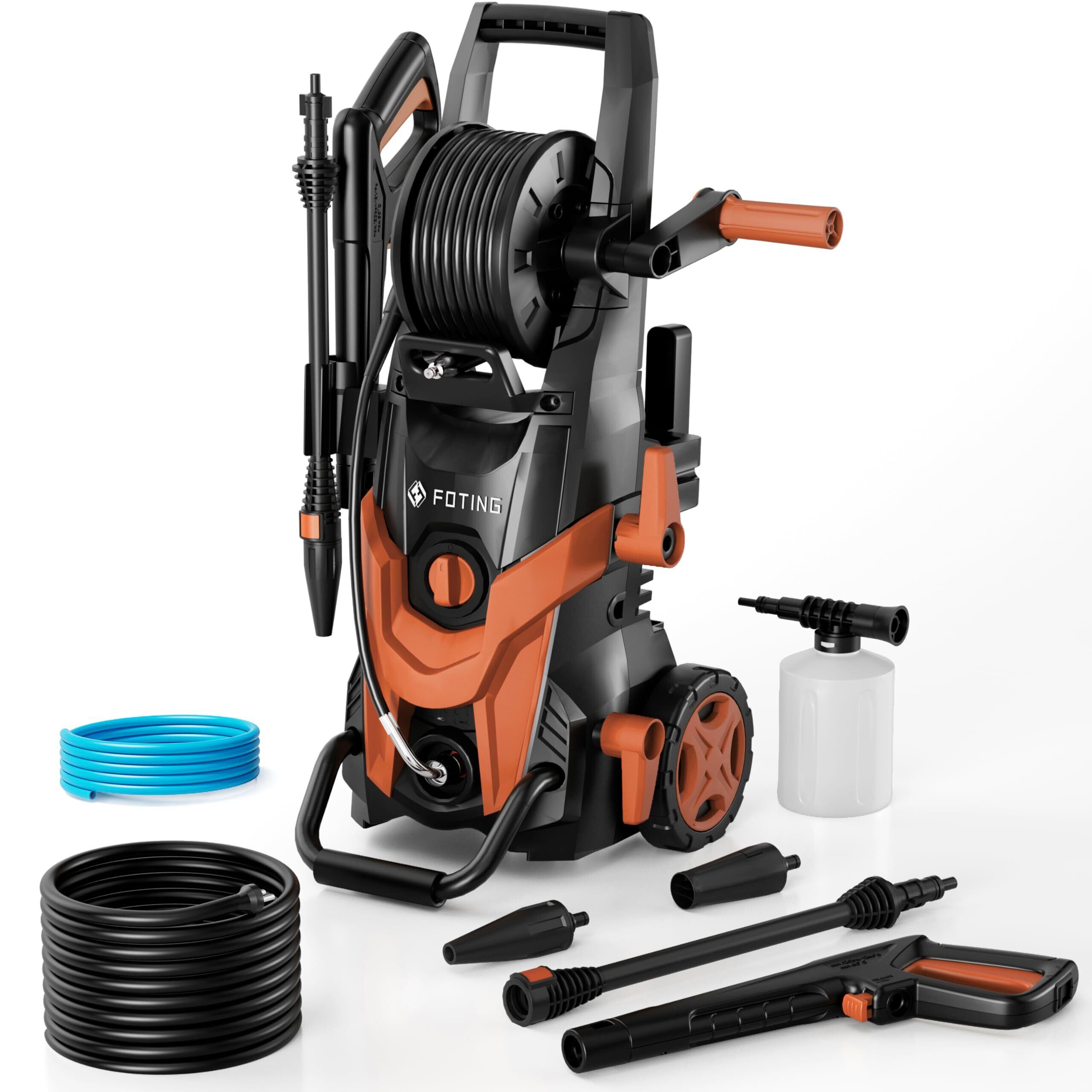 FOTING 高圧洗浄機 14.5MPa パワフル洗浄 コンパクト収納 簡単持ち運びタイヤ 標準付属品充実 二つハイパワーなノズル モバイル家庭用高圧クリーナー 洗車 自転車 庭 ベランダ 泥 花粉除去効果 50/60HZ