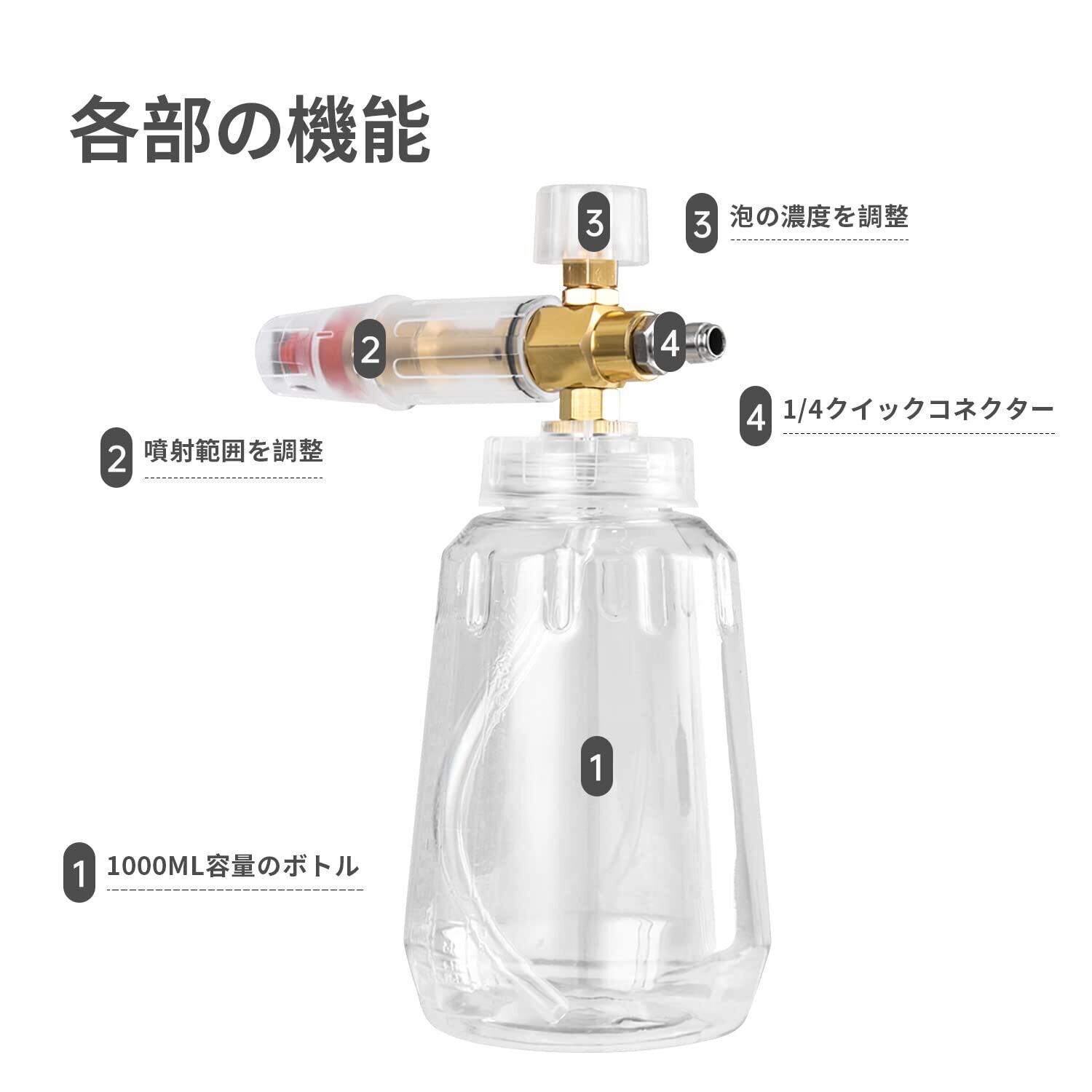 【素材】合金、ステンレス、プラスチック;ボトル容量:1000ml(1L);最高水温:60℃。内容:フォームランスボトル、接続アダプター、吸引式チューブ。精密に製造された金属製インジェクターは、石鹸の混合比率が少なく、豊富で高密度のフォームをします。目盛線付きの透明なポット本体は、ボトル内の液体がはっきりと見え、いつでもどこでもボトル内の液体容量が分かります。