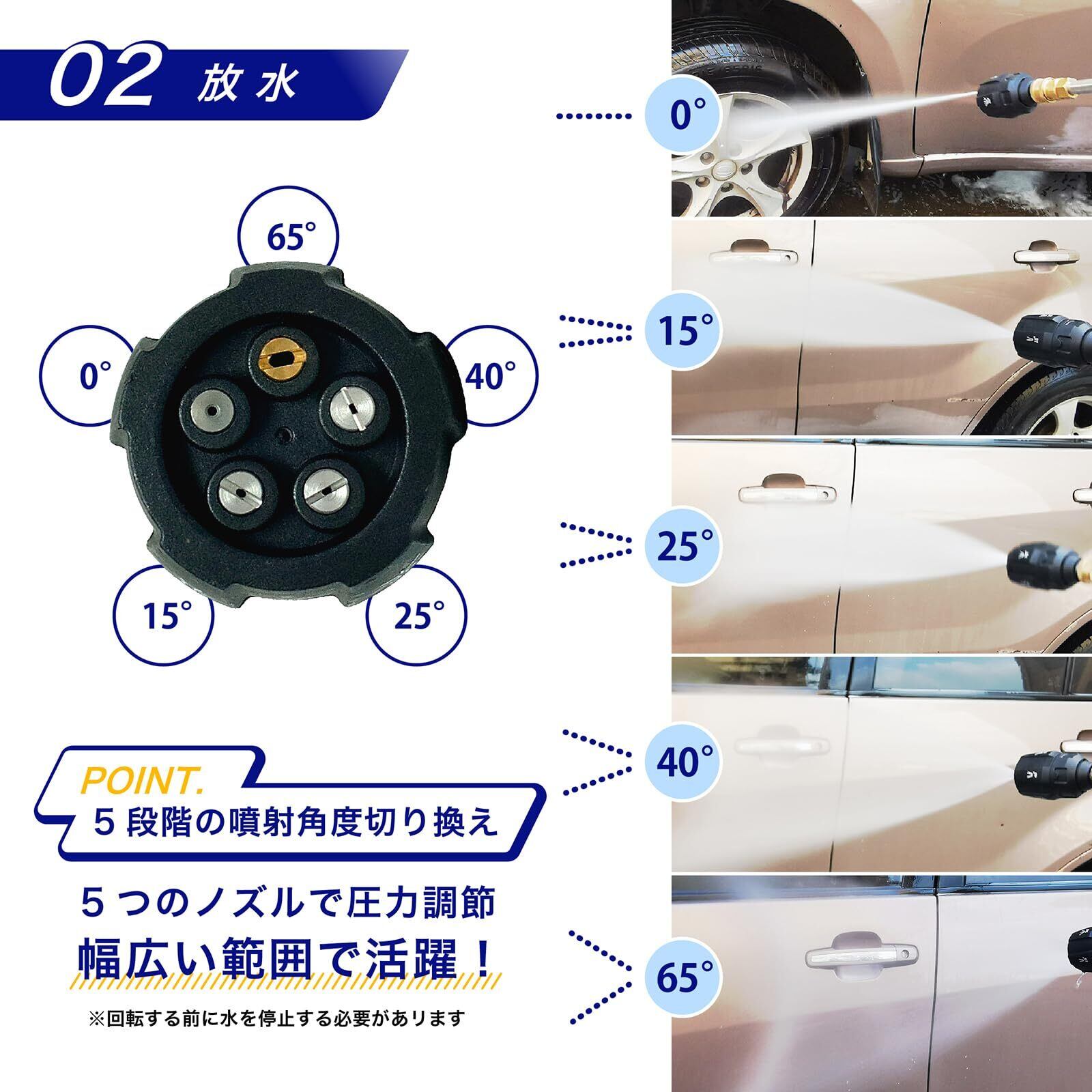 【5in 1調整可能ノズル】 ノズルの先端を回すことで、必要に応じた水圧調整が可能です。0°設定では強力な水圧で頑固な汚れを効率的に除去できます。高圧洗浄が必要な車やバイク、舗装タイル、外壁、ベランダなどの汚れや苔・藻をきれいに洗い流します。65°設定では高圧洗浄ではなく、シャワーのような柔らかな水圧になります。日常生活での庭のお手入れや植物への水やり、軽めの洗車にもご利用いただけます。