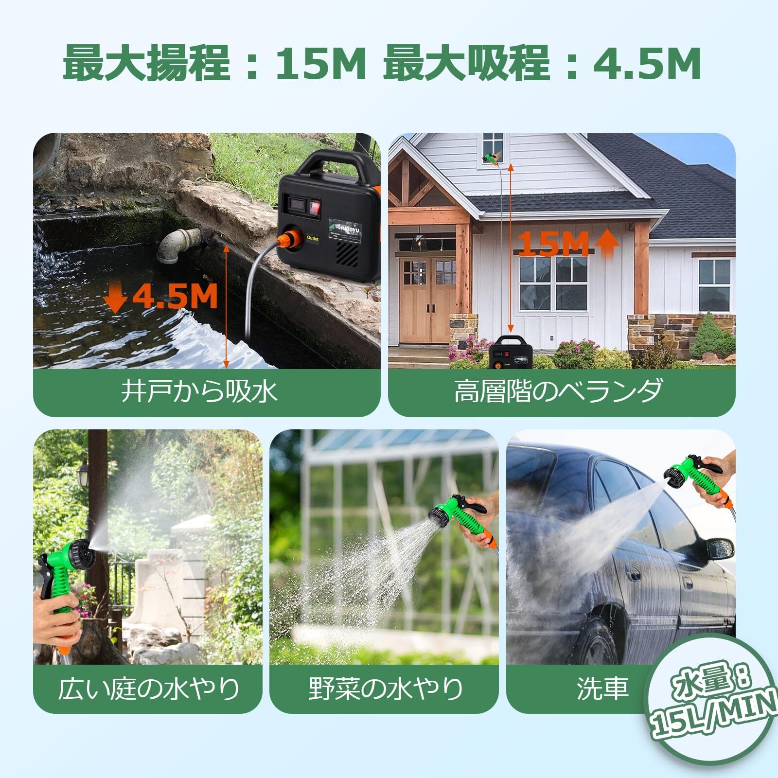 【4.5m吸程で多様な水源対応】充電式排水ポンプの水量は最大15L/MINに達し、最高揚程は15Mで、高層階のベランダや広い庭の水やりに対応します。最大吸程は4.5Mで、井戸・深いバケツから効率的な吸水も可能です。