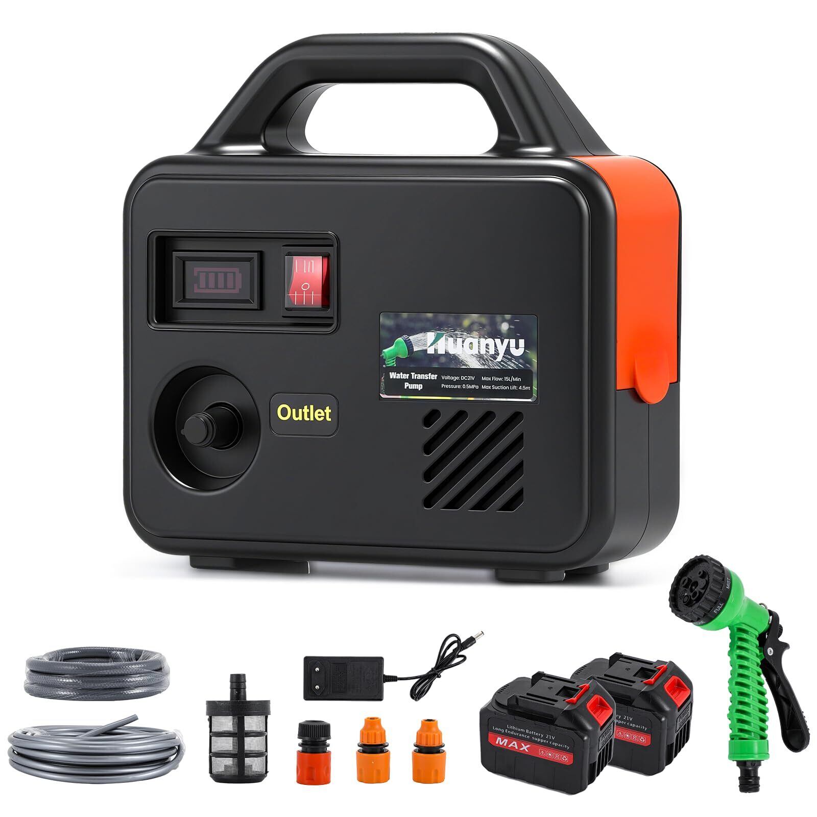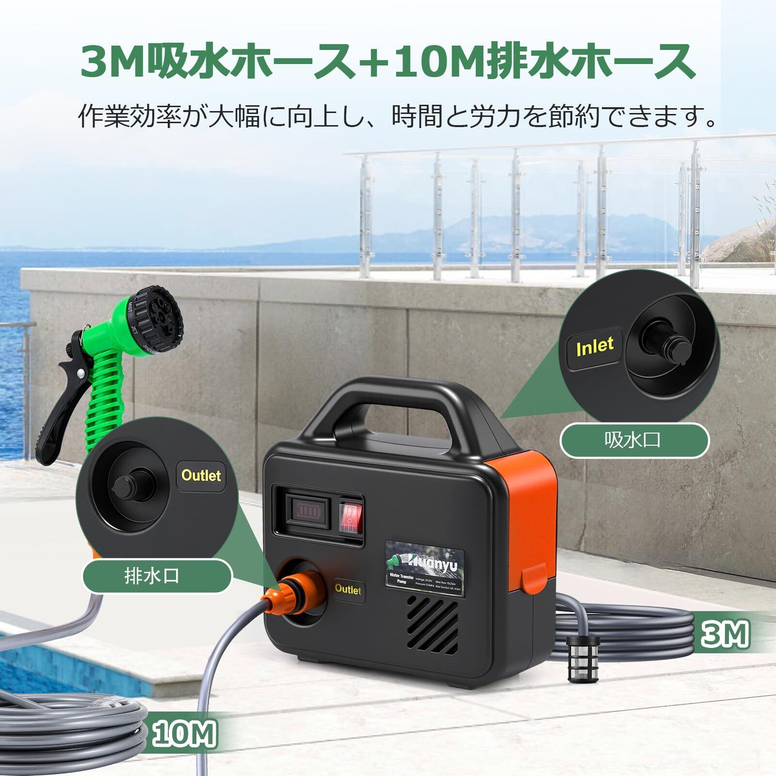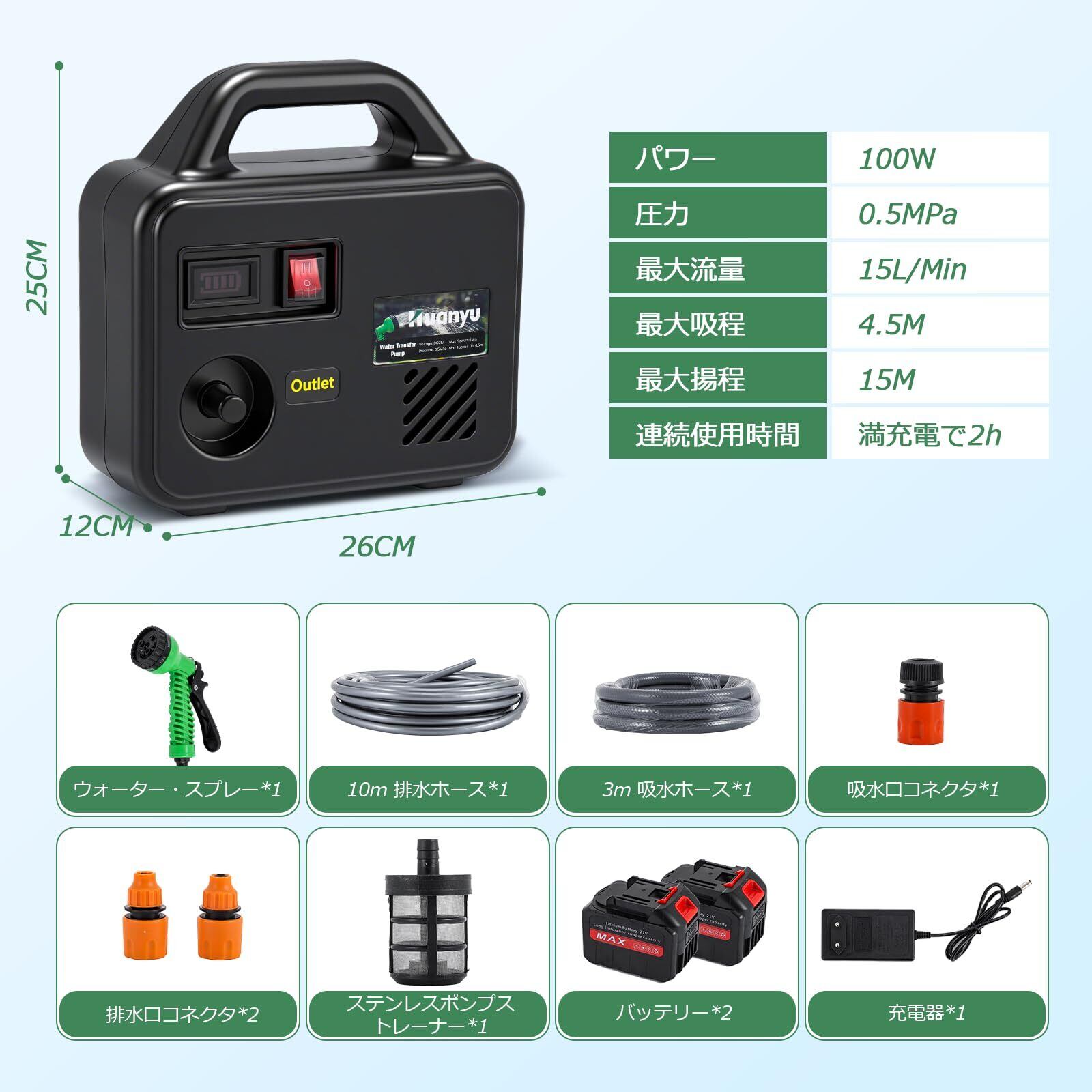Huanyu 自吸式ウォーターポンプ 充電式 水中ポンプ コードレス 15L/MIN バッテリー1500mAh*2 最大揚程15M/吸程4.5M スプレーガン7段調整 100W 水耕栽培/洗車/庭園灌漑用 3M進水管+10M出水管