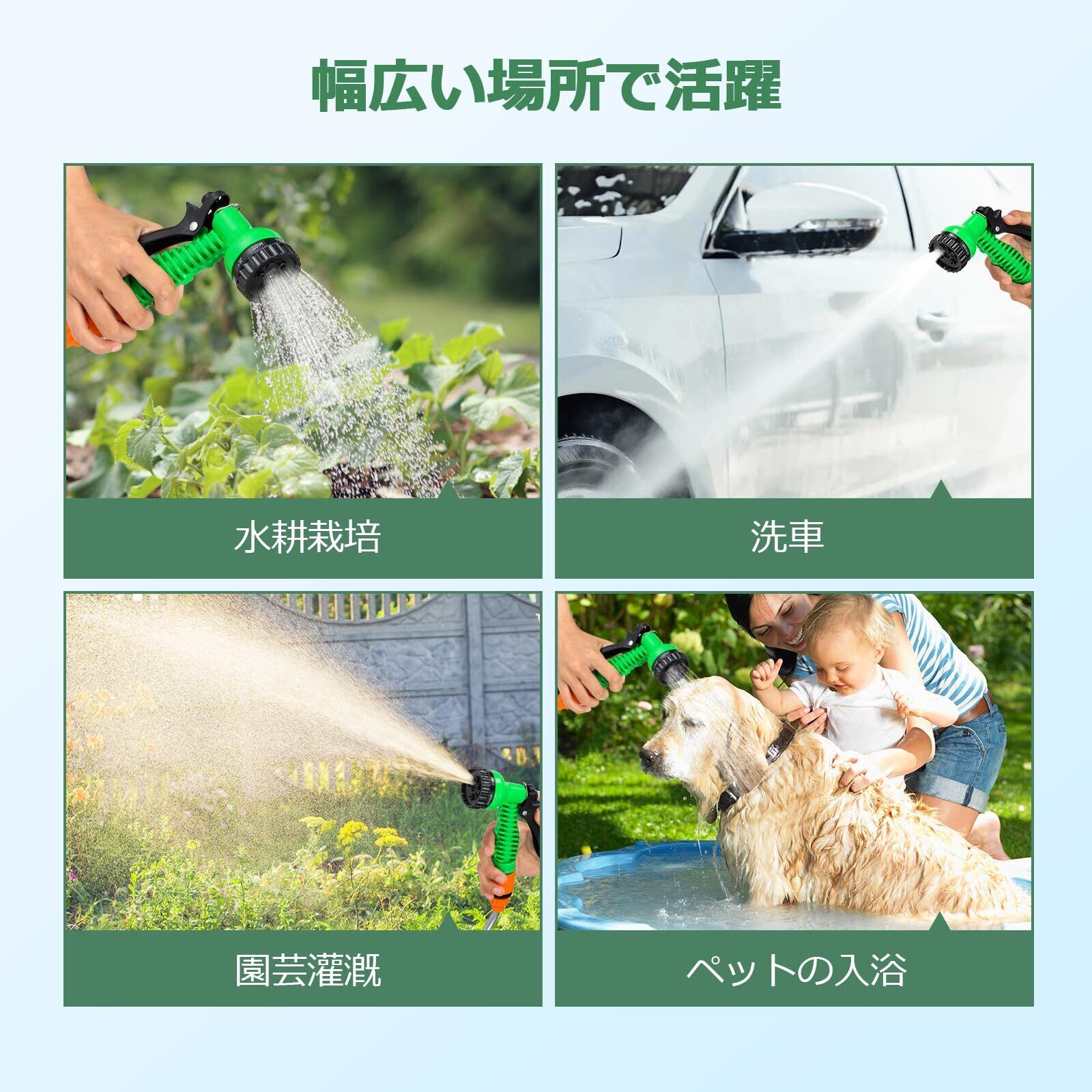 【7段階水流調整】7種スプレーモード(シャワー/直射/霧状等)は洗車時の汚れ落としから繊細な植物への水やりまで、回転式切り替えで、必要に応じて水流を自由に調整します。