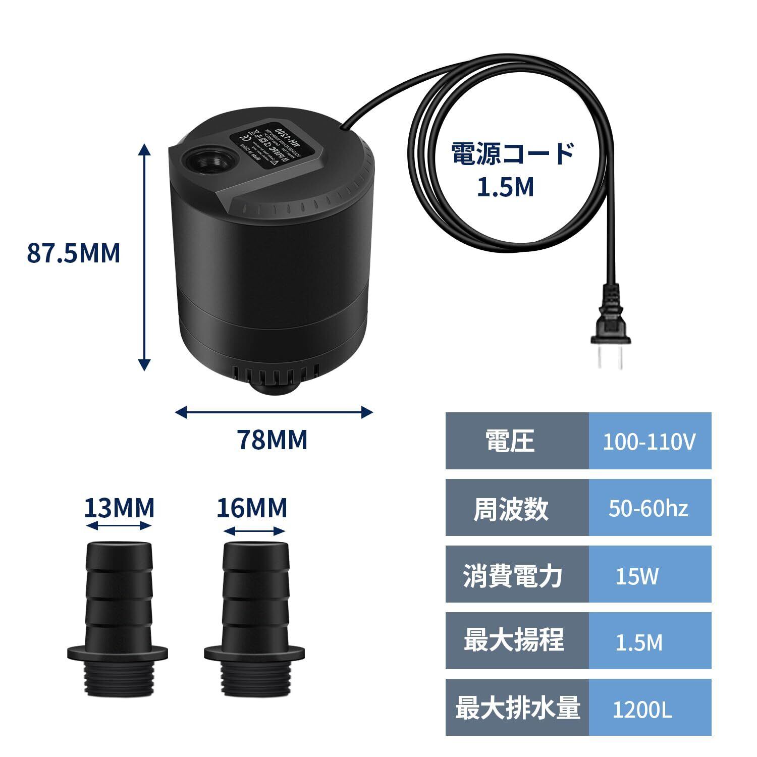 【仕様】入力電圧:AC 100V-110V/50-60Hz 電力:15W 最大揚程:1.5Mぐらい 吐き出し口外径:13mm*1枚&16mm*1枚最大流量:1200L/H 電源コードの長さ:1.5M 騒音クラス:40デシベル以下 ご注意:電源を入れて水が出ない場合、ポンプの中に空気があって排出できない可能性があり、ポンプを水面に出してまた水に入れて空気が排出できます。空気を排出すれば正常に使用できます。