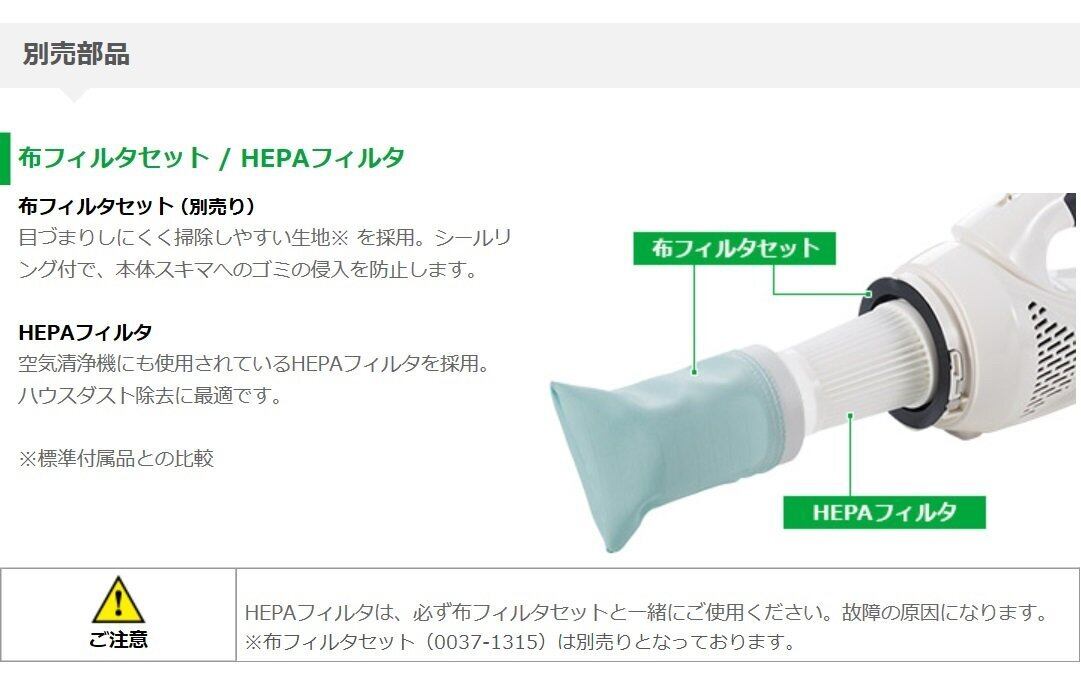 ご注意:HEPAフィルタは14.4V・18V製品専用です。HEPAフィルタは、必ず別売り布フィルタセット(0037-1315)と一緒にご使用ください。