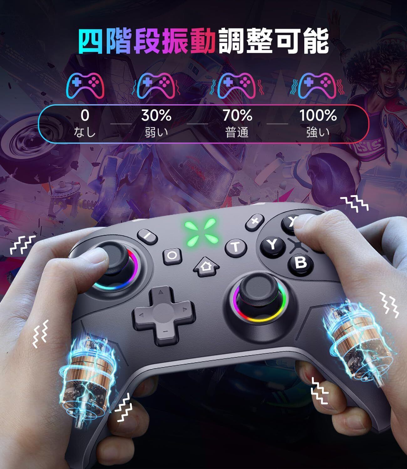 【4段HD振動&背面マクロボ&RGBライト】高感度モーションコントロールで精密な視点操作を実現。4段HD振動の科学:スイッチ コントローラーは内蔵4段階振動(0%/30%/70%/100%)を搭載し、ゲーム内の物理演算と連動します。優れた振動により、臨場感が劇的に強化されます。 背面のM1/M2ボタンを使うことで、最大32個の連続コマンドを記録・実行できます。スムーズな操作性を実現。 プロコントローラーSwitchには9色のRGBライトと4種類のライトモードが搭載されており(RGBライトモード(デフォルトモード)/呼吸モード/レーザーモード/消灯)ゲームの雰囲気やお好みに応じて、ワンタッチで簡単にカスタマイズ可能です。