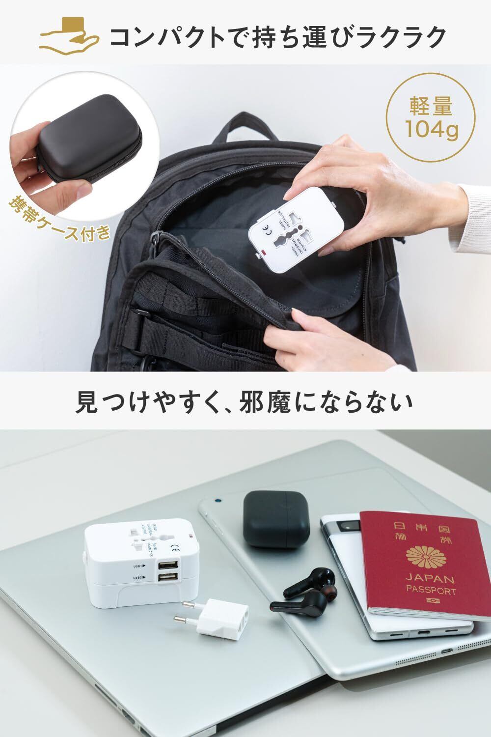 【コンパクト×軽量×ダブルUSB充電ポート】:ただでさえ荷物が増える海外旅行なので、なるべくかさばったりスペースを取らないように、”シームレスプラグデザイン”という裏面の各タイプのプラグが折りたためる独自デザインを採用。手のひらサイズのコンパクトサイズに。また、軽さも以前のモデルに比べて、50g軽量化し、90gを実現。サッと取り出せて充電できるので、持ち運びもストレスフリーです。