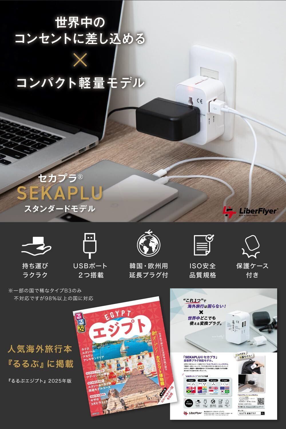 【世界190カ国で使えるスマート変換プラグ "セカプラ"ベーシックモデル】: ※こちらの製品は「海外での使用のみを目的とした製品のため日本での使用不可」になります。日本人外国旅行者及び外国人観光客が海外での使用を対象とした製品になります。 「韓国や一部ヨーロッパにてプラグの長さが足りなく届かなかった・・」と言うお声に応じ、韓国や一部欧州国のタイプC のみ対応した延長プラグも付属しています。特に、韓国は一般的な類似商品ですとプラグが届かなく充電ができないことが多い報告を受けておりますので推奨しております。