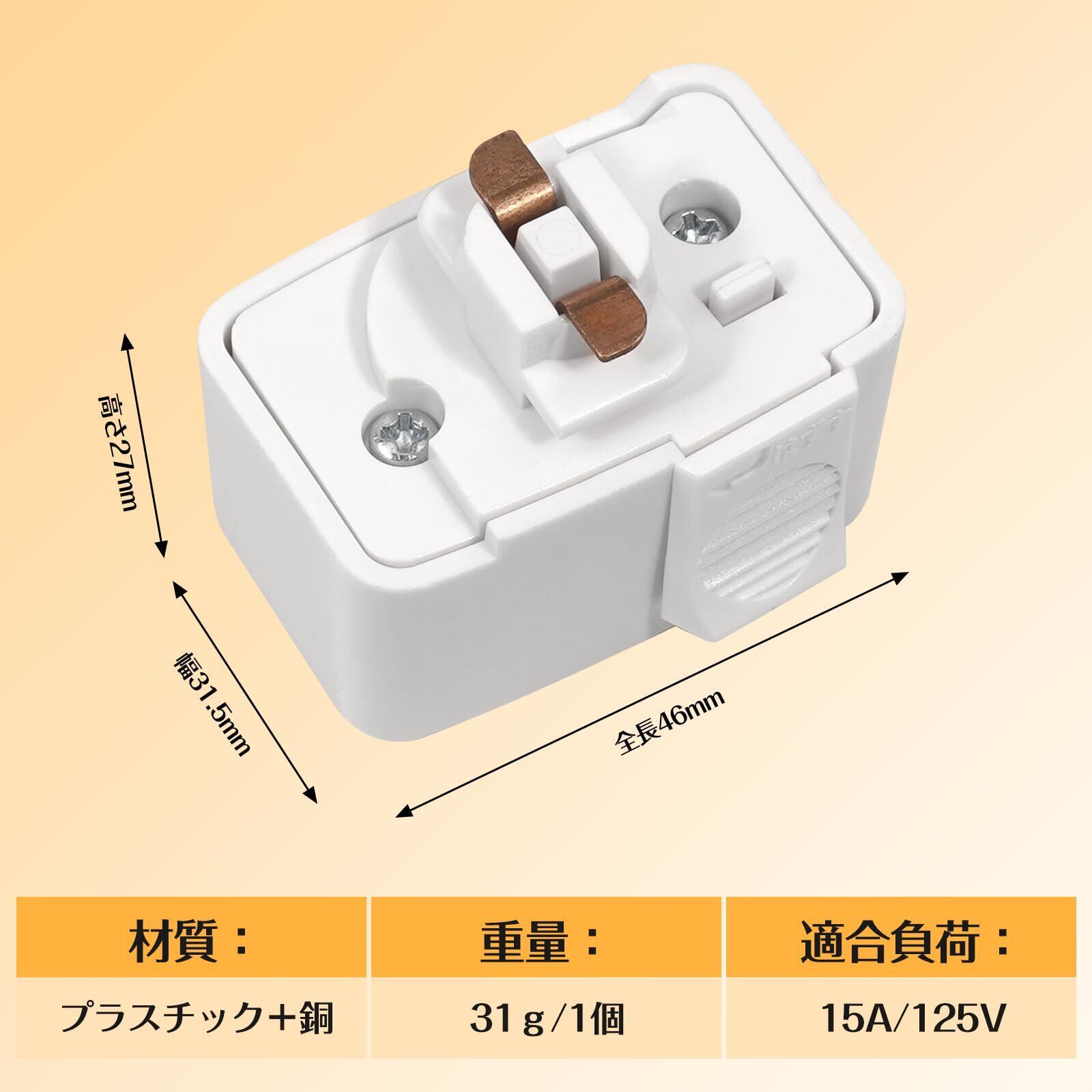 1. レール用 プラグ 包装:1個入り、色: 白い、サイズ:高さ27mm×幅31.5mm×全長46mm、材質:プラスチック+銅、重量:31g/1個、適合負荷: 15A/125Vまで。
