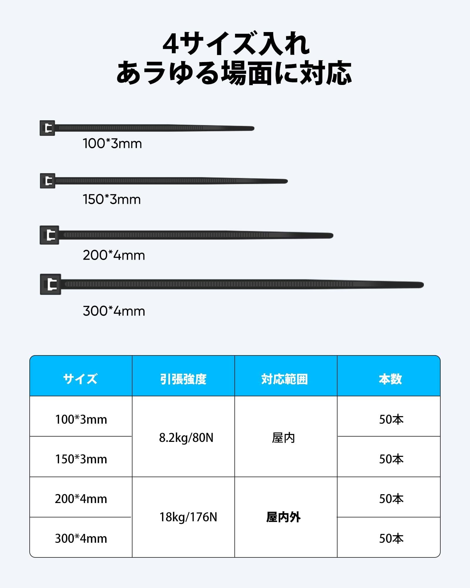 【経済的結束バンド 】4つのサイズがあり、あらゆる場面に使用でき、ホームやオフィスや作業現場やバイクなどのケーブル収納、庭や猫ケージやブラケットなどの固定し、さまざまな場面に適しており、生活に便利さをもたらします。*4つのサイズ結束バンドの中には100*30mm、150*30mm、200*40mm、300*40mm各50本を含みます。