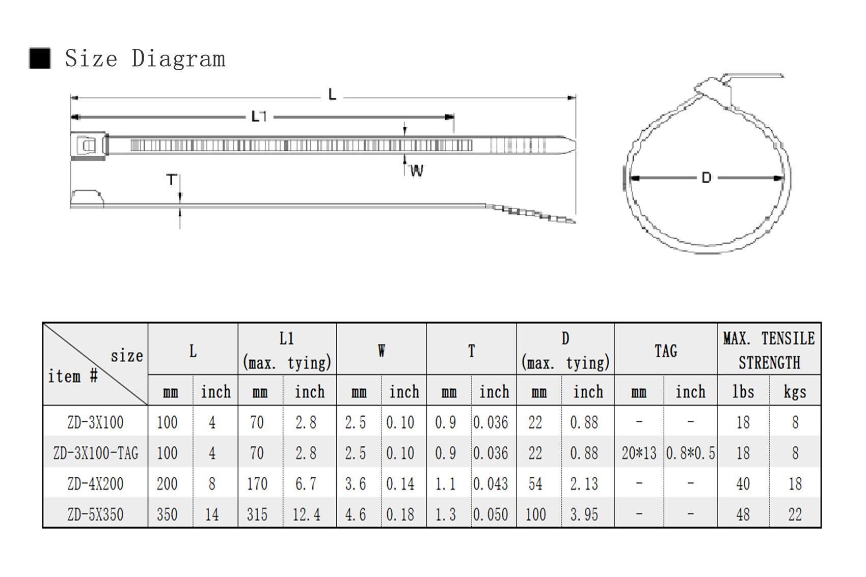 サイズと包装:300本入;長さ=100mm,幅=2.5mm,厚み=0.9mm,最大結束長さ=70mm,最大結束直径=22mm,最大張力=18lbs/8kgs。
