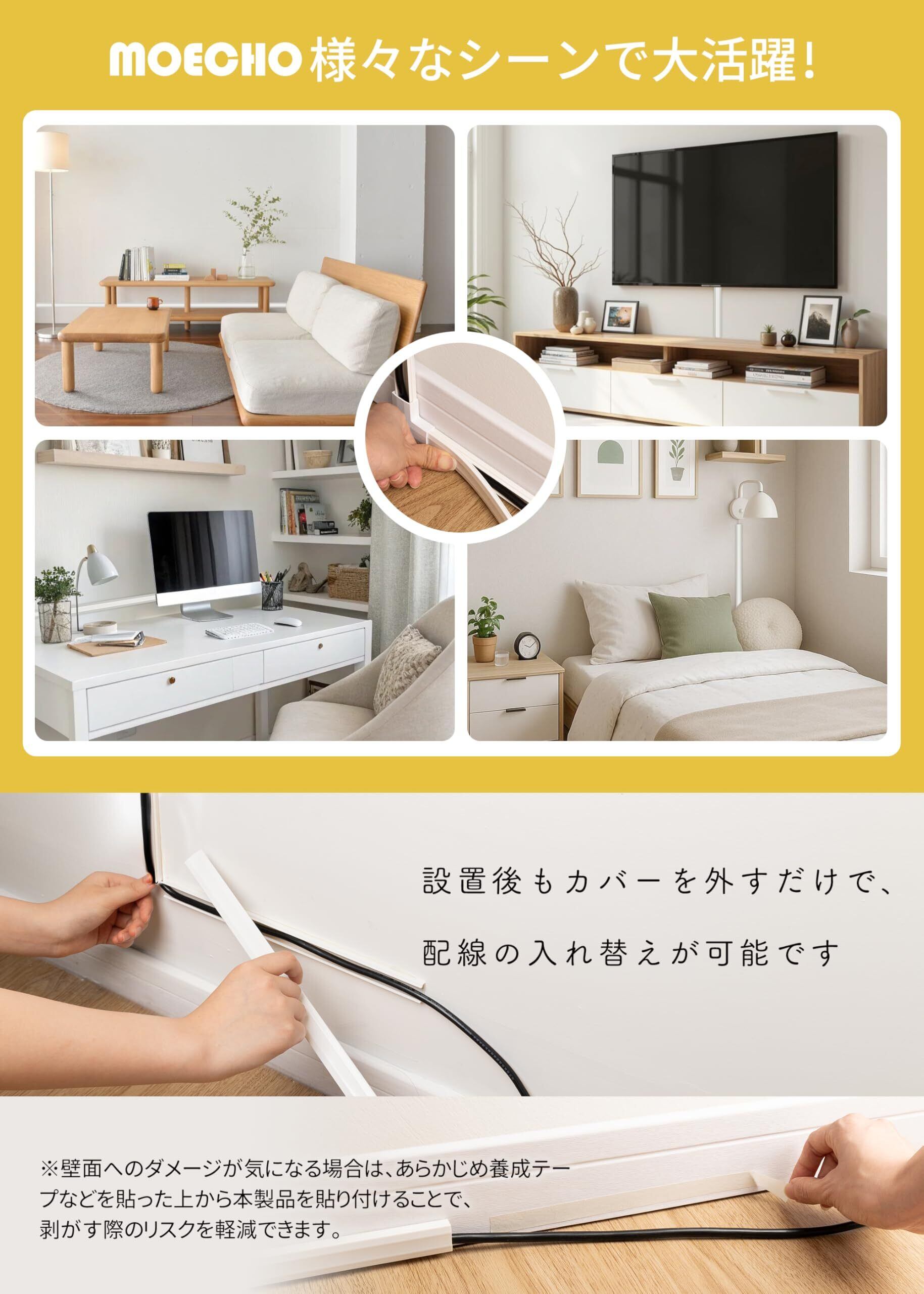【ケーブルすっきり収納・空間をスマートに演出】乱雑になりがちな電源コードやLANケーブルをまとめてカバーし、空間全体をスタイリッシュに整えます。壁沿いや床まわりの配線を目立たなくすることで、見た目の印象が引き締まり、掃除の手間も軽減します。ご家庭からオフィスまで、さまざまな場所で活躍する配線整理アイテムです