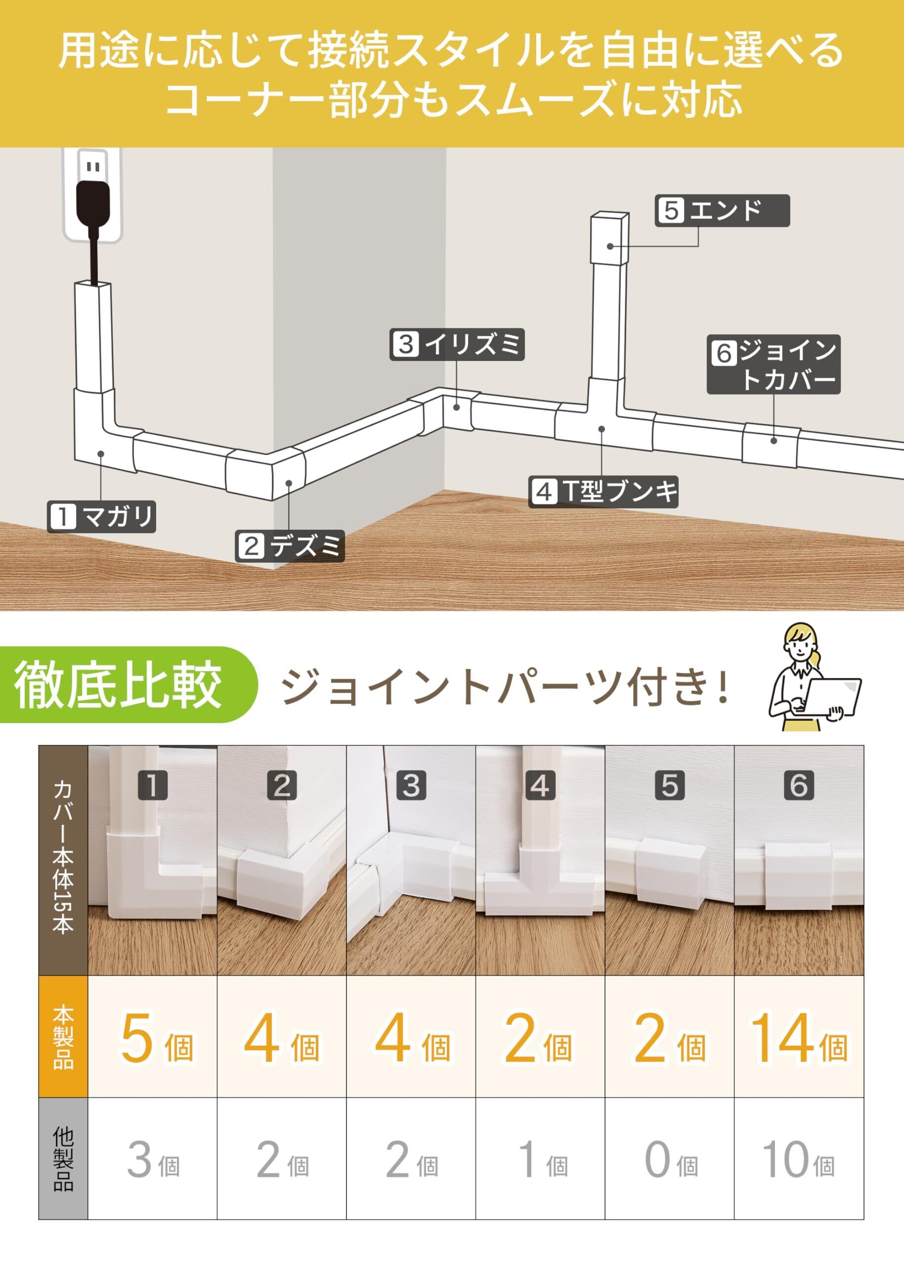 【豊富な接続パーツ入り・複雑な配線も美しく処理】L字・T字・終端キャップなど、用途に応じたジョイントパーツを豊富に付属しています。直線だけでなく、コーナーや分岐のある複雑な配線レイアウトにも柔軟に対応可能。デスク周りやテレビ台の裏側、オフィスの床下など、あらゆる空間に合わせて美しく配線を整理できます。
