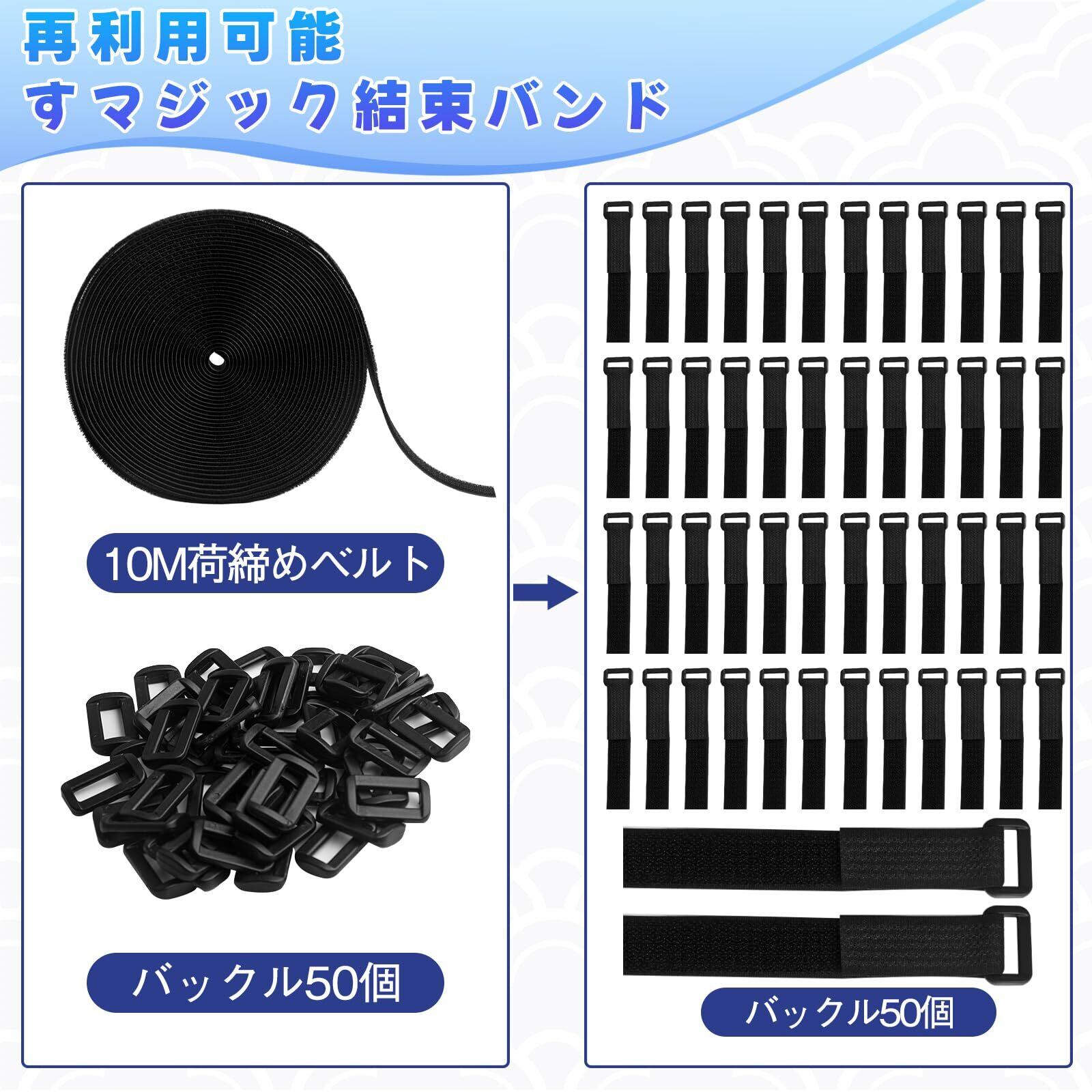 マジック結束バンド 荷締めベルト ベルクロ 面ファスナー固定ベルト 長さ10m*幅2cm 50個バックル付き 結束テープ 強力 耐熱 自由にカット 繰り返し DIY用 荷物梱包 配線整理 収納用テープ (2cmx10m)
