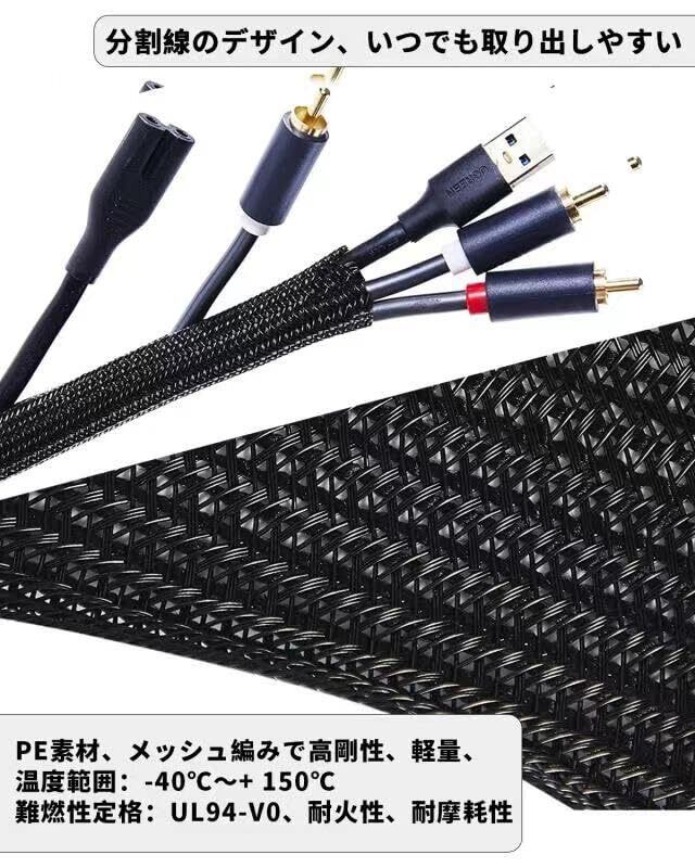耐熱&耐摩耗性: テレビケーブル管理スリーブは耐久性のあるPET素材でできており、温度範囲:-40℃〜+ 150℃、難燃性定格:UL94-V0、耐火性、耐摩耗性、柔軟性、防塵性、簡単性の利点を備えています迅速な操作と噛み付き防止。