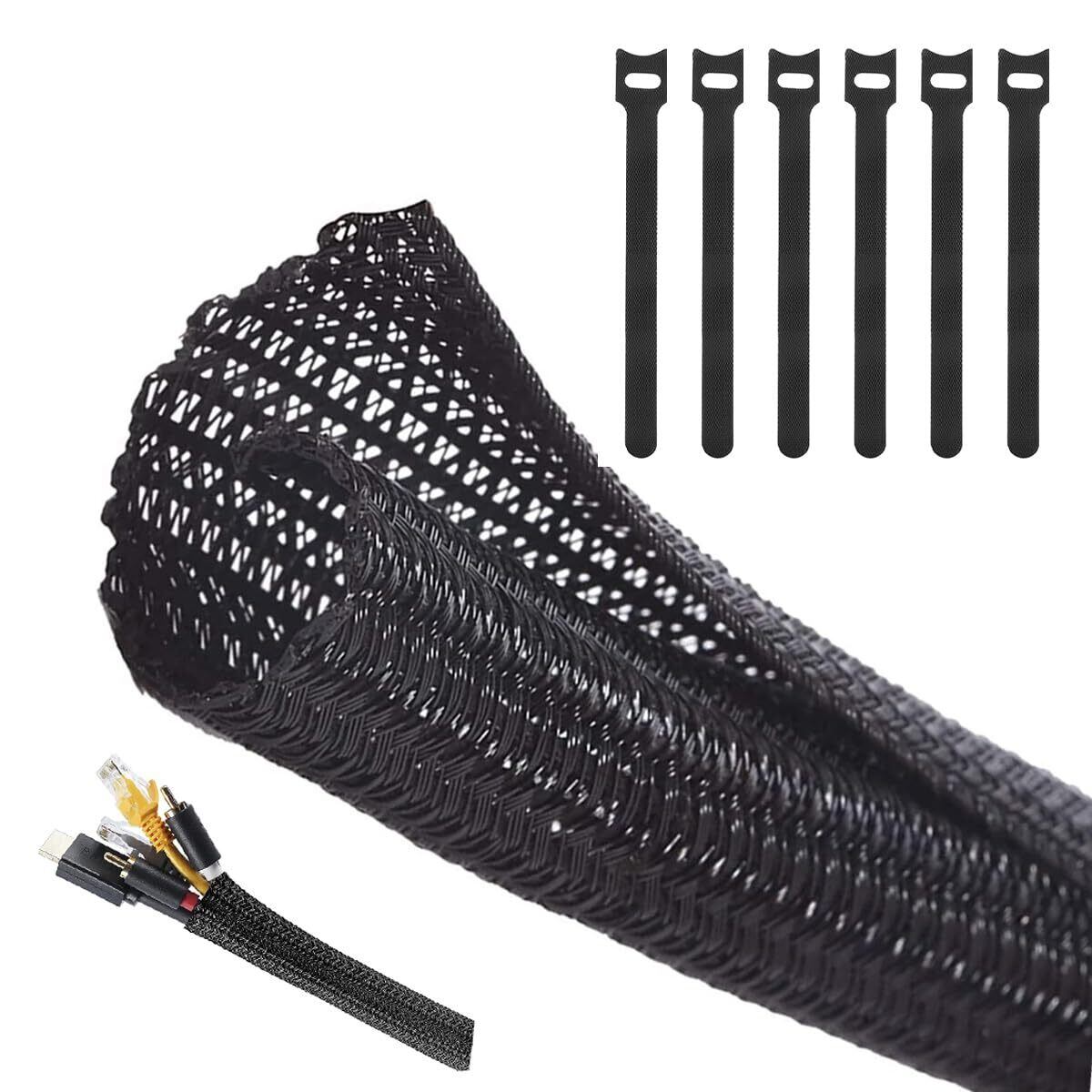 ケーブル収納スリーブ 5M直径13mm 黒編組ケーブルカバー、DIY切断可能 耐火性、耐摩耗性屋外/屋内用/オフィス用コードオーガナイザー、ケーブルプロテクター動物の噛み込み防止 マジックケーブルタイ6本付属 (5M)