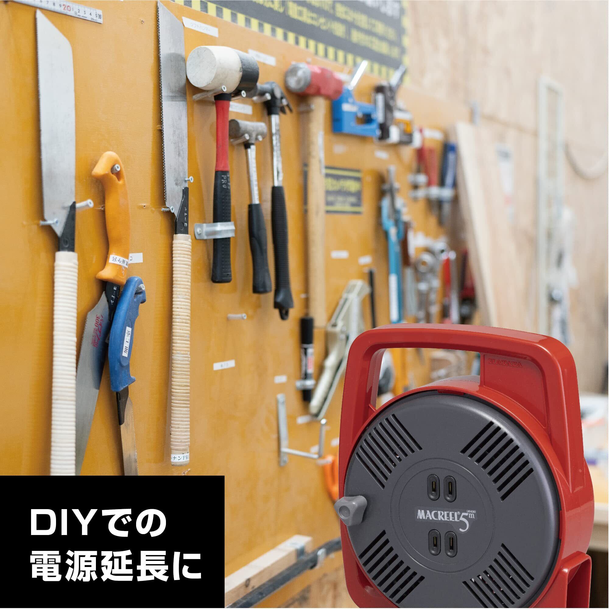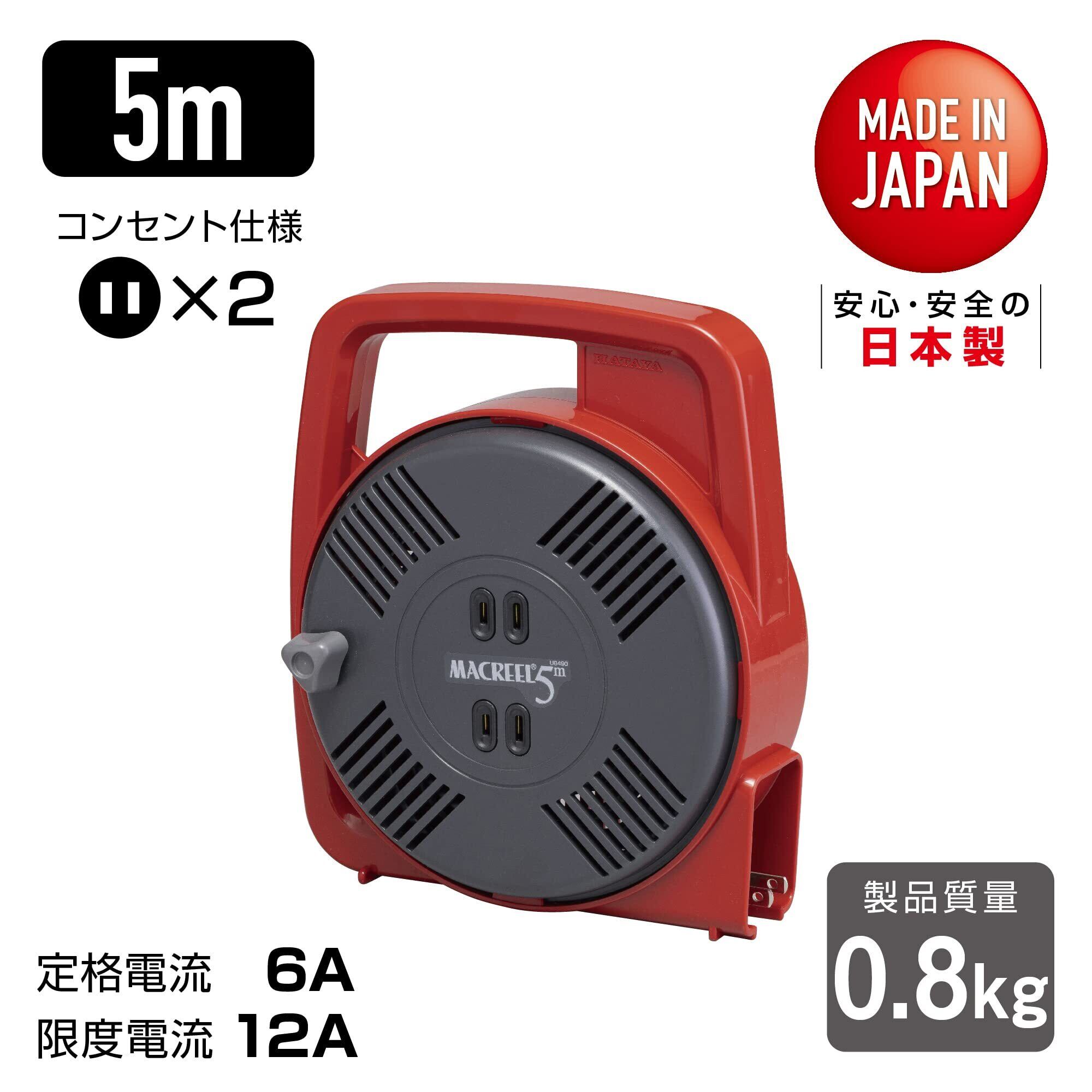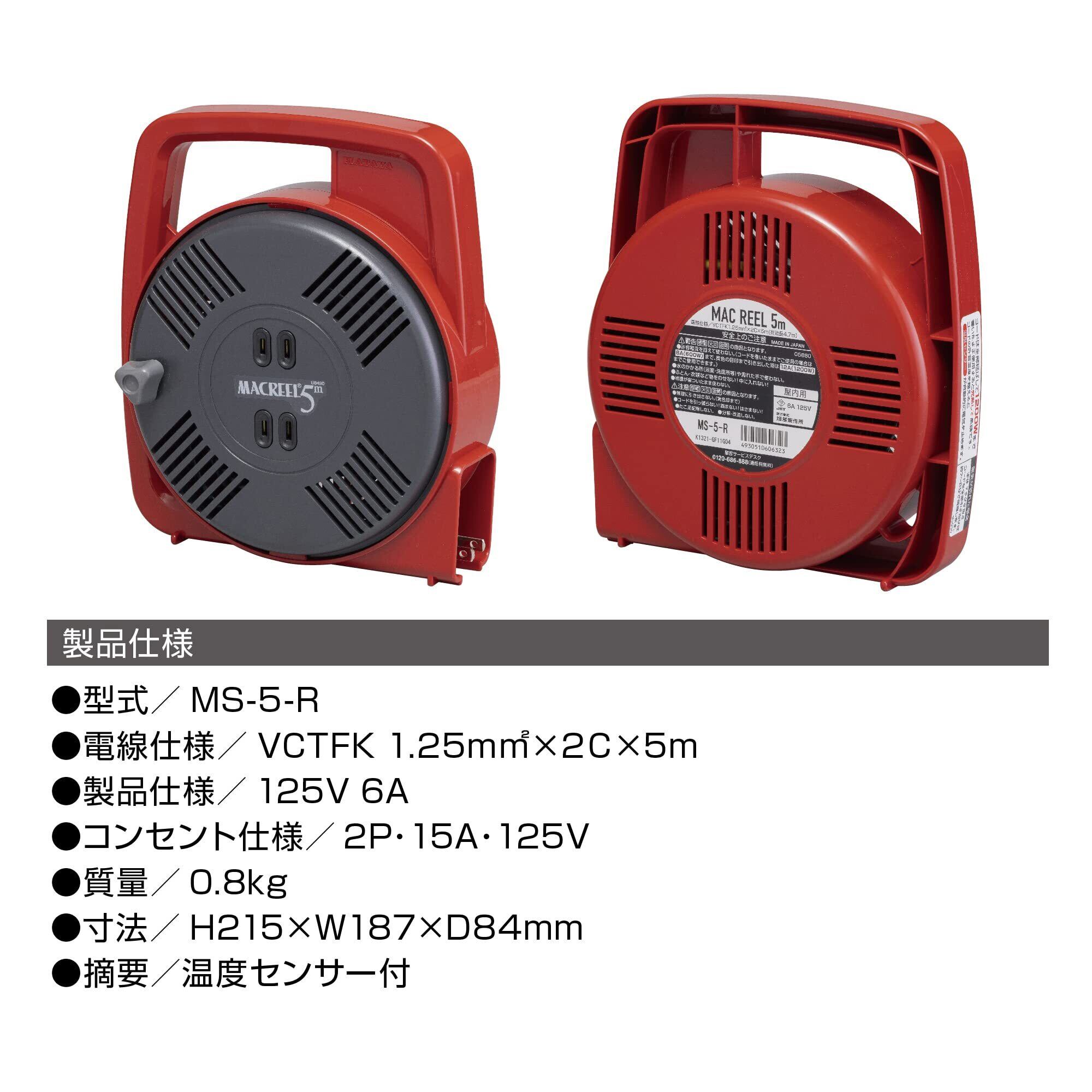 ハタヤ (HATAYA) コードリール 屋内用 ホームリール 100V型 手動巻 5m 温度センサー内蔵 (電線溶解防止機能) コンセント2個 コンパクト 家庭用 ギフト用 マックリール MS-5-R レッド