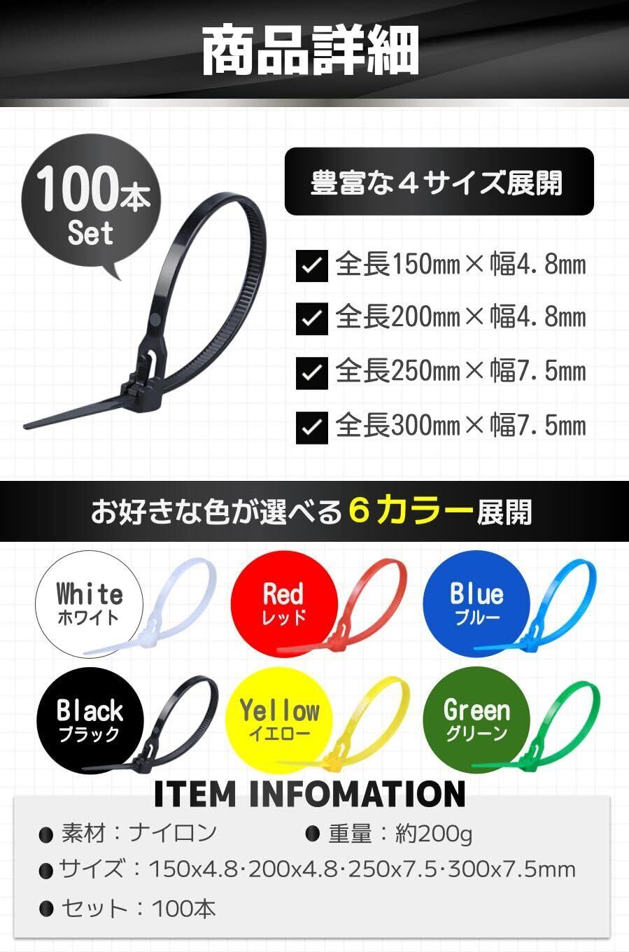 【商品特徴】①再利用可能で便利!:簡単にタイを緩められて何度でも使用OK!/②室内・屋外使用OK:寒さや暑さにも耐性の強い素材で安心/③嬉しい100本セット:ご自宅のあらゆる場所に使えて嬉しい大容量/④豊富な色・サイズ:用途に合わせてお好きなものを選べます