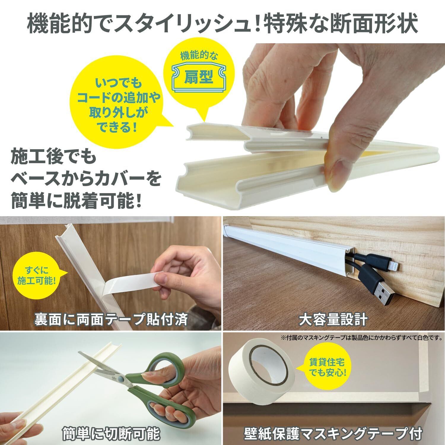 【セット内容・サイズ】配線カバー(両面テープ付き)12本、コネクタパーツ30個、マスキングテープ1個。外寸400mm ×25mm ×13mm 、内寸23mm×11mm。 ※マスキングテープ使用の際の注意事項…接着面をきれいにし、必ず巾木や窓枠に沿って配置してください。荷重がかかる複数のコードを通したり、ACアダプタをぶら下げたりして、過度な荷重をかけないようご注意ください。