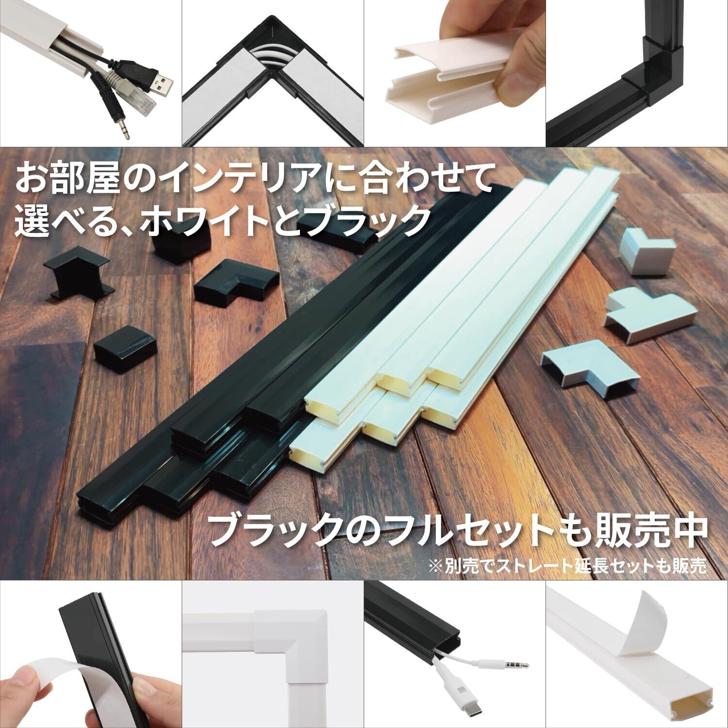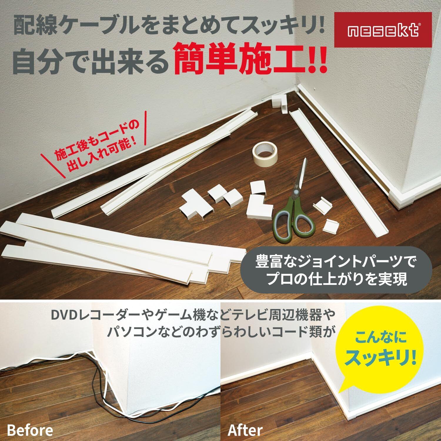 【数量限定】[ネセクト] 両面テープ貼付済 配線カバーセット 40cm直線モール12本(4.8m)+ジョイントパーツ5種類+壁紙保護用マスキングテープ付 [日本国内企画品] (フルセット ホワイト, 1セット)