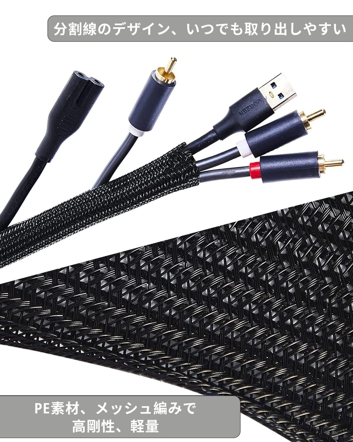 耐熱&耐摩耗性: テレビケーブル管理スリーブは耐久性のあるPET素材でできており、温度範囲:-40℃〜+ 150℃、難燃性定格:UL94-V0、耐火性、耐摩耗性、柔軟性、防塵性、簡単性の利点を備えています迅速な操作と噛み付き防止。