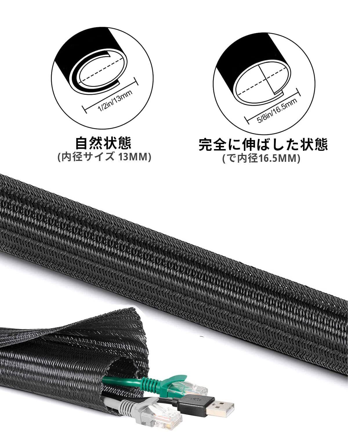 【特別価格】ケーブル収納スリーブ 長さ約2M 直径13mm 黒編組ケーブルカバー、DIY切断可能 PET素材 家庭用/オフィス用コードオーガナイザー、ケーブルプロテクター動物の噛み込み防止