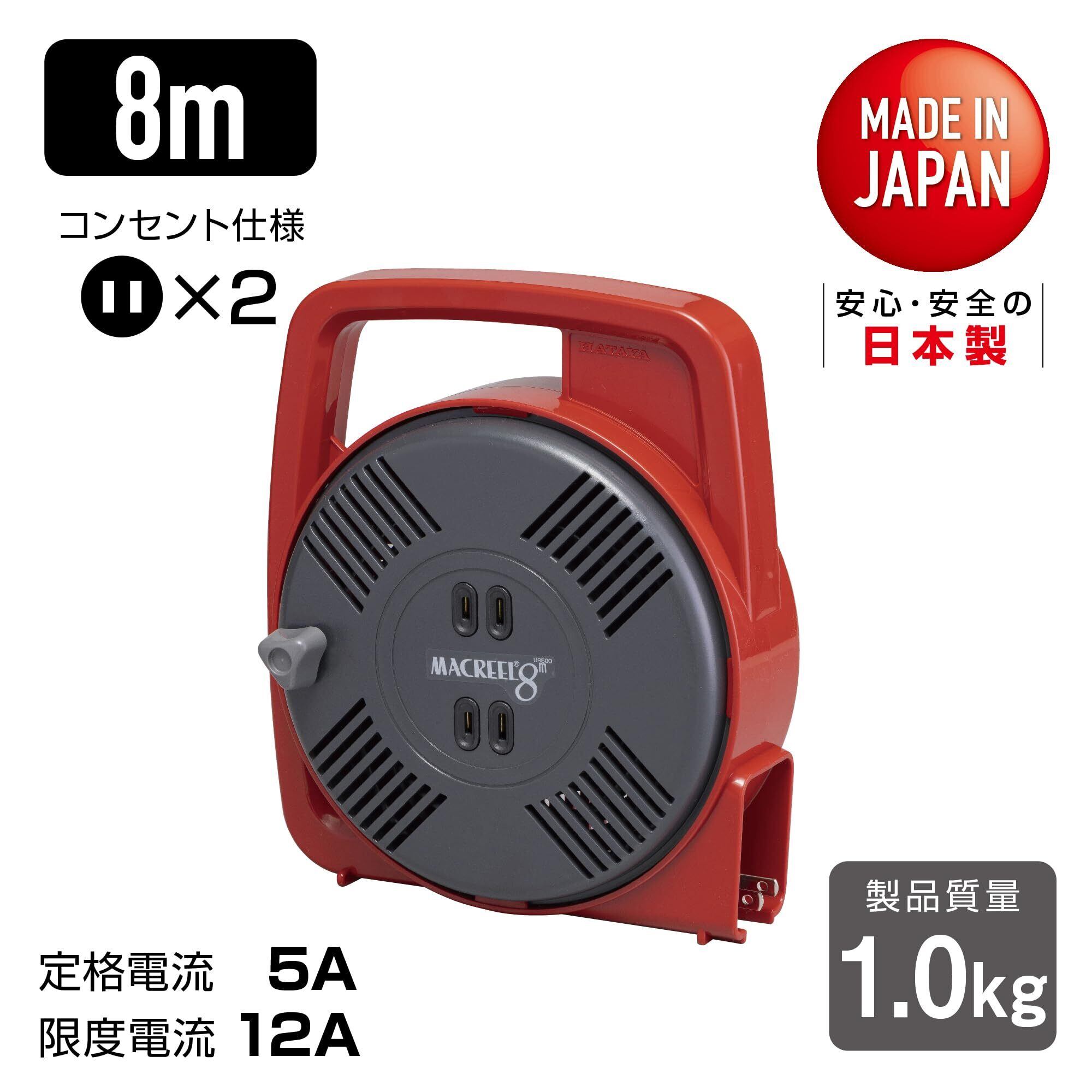 【2025最新】ハタヤ (HATAYA) コードリール 屋内用 ホームリール 100V型 手動巻 8m 温度センサー内蔵 (電線溶解防止機能) コンセント2個 コンパクト 家庭用 ギフト用 マックリール MS-8-R レッド