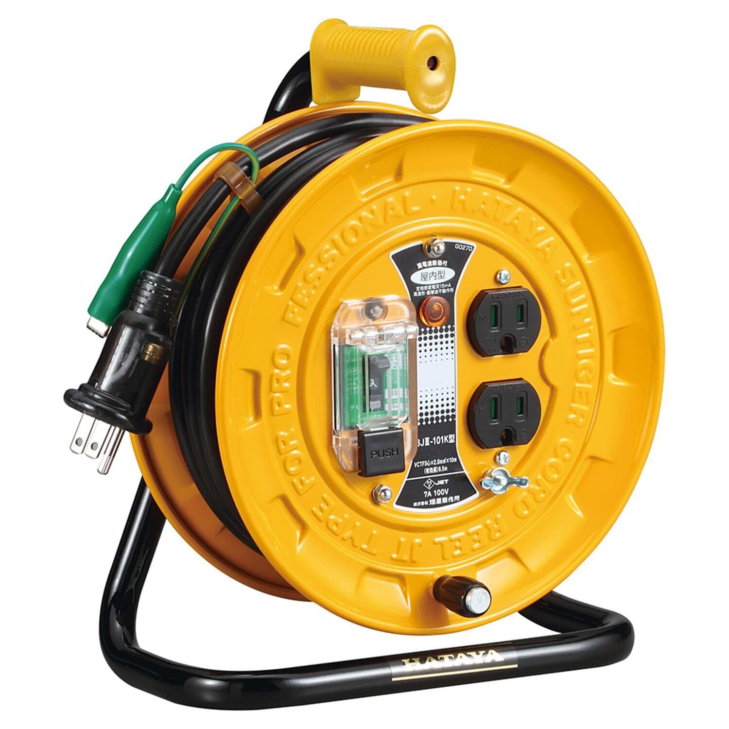 ハタヤ (HATAYA) コードリール 小型 コンパクト 屋内用 100V型 コード10m 太さ2.0㎟ 漏電遮断器 接地付 コンセント2個 コンセント防塵シャッター 家庭用 工場用 建設現場 軽作業 JTIII BJIII-101K