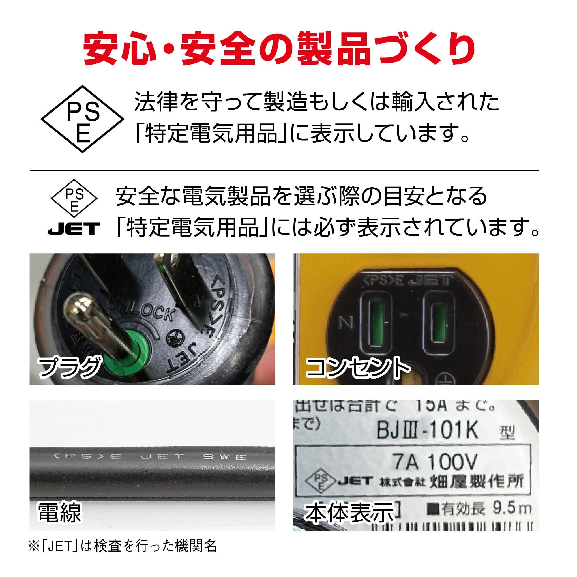 その他特長:漏電遮断器(漏電地絡保護専用型)、2P/2P接地付兼用フキュートビプラグ、コンセント防塵シャッター、パイロットランプ内蔵、ドラム空転止め(ブレーキストッパー)