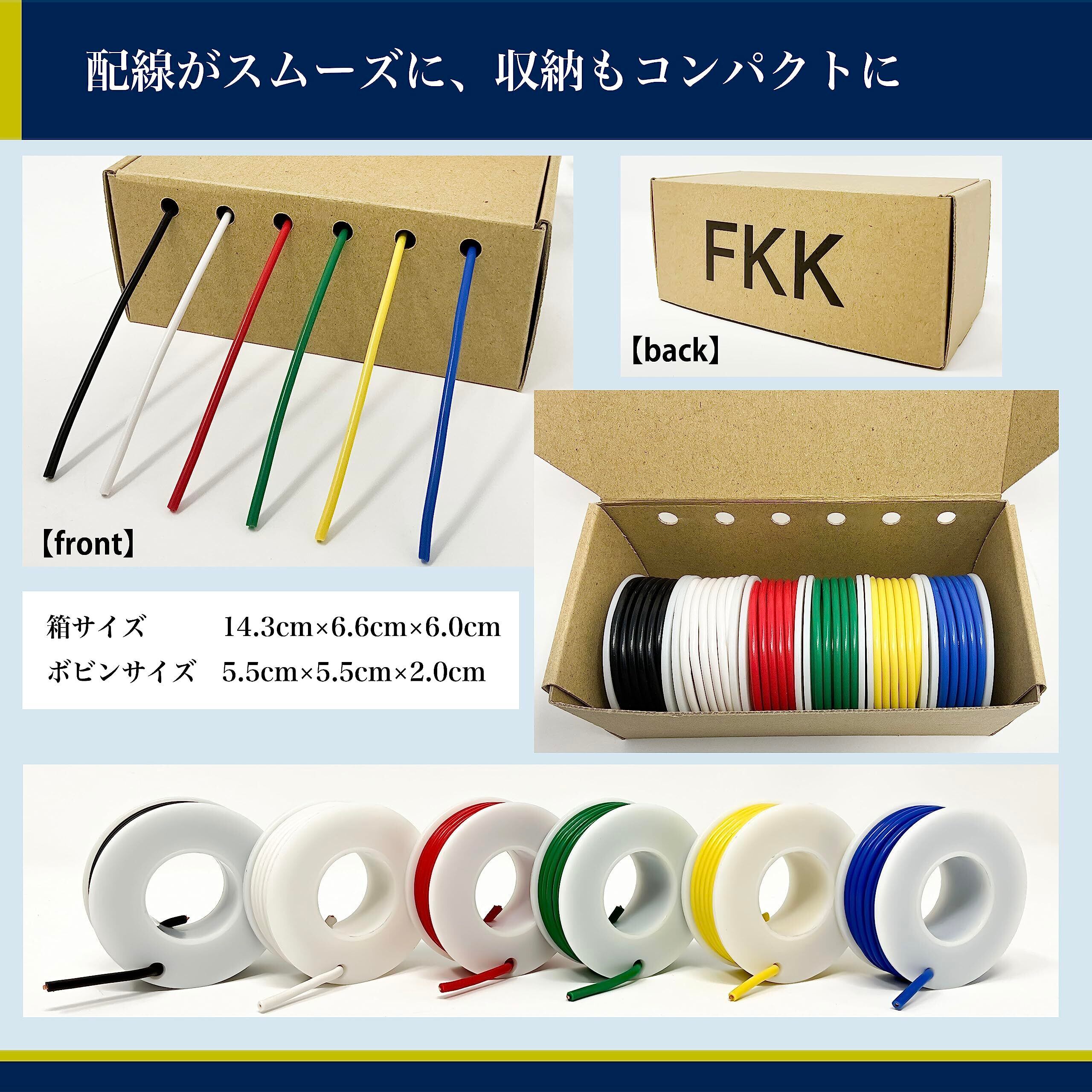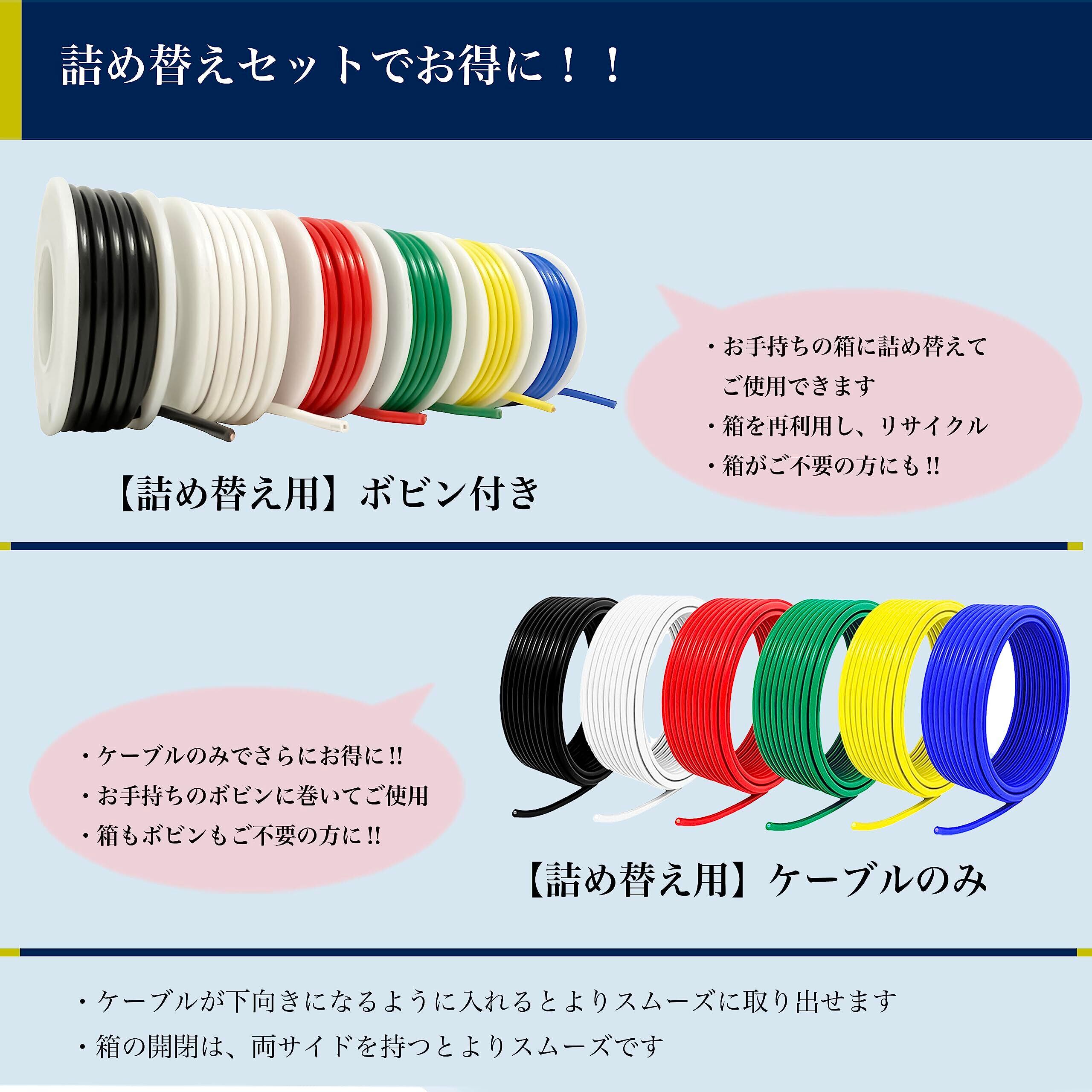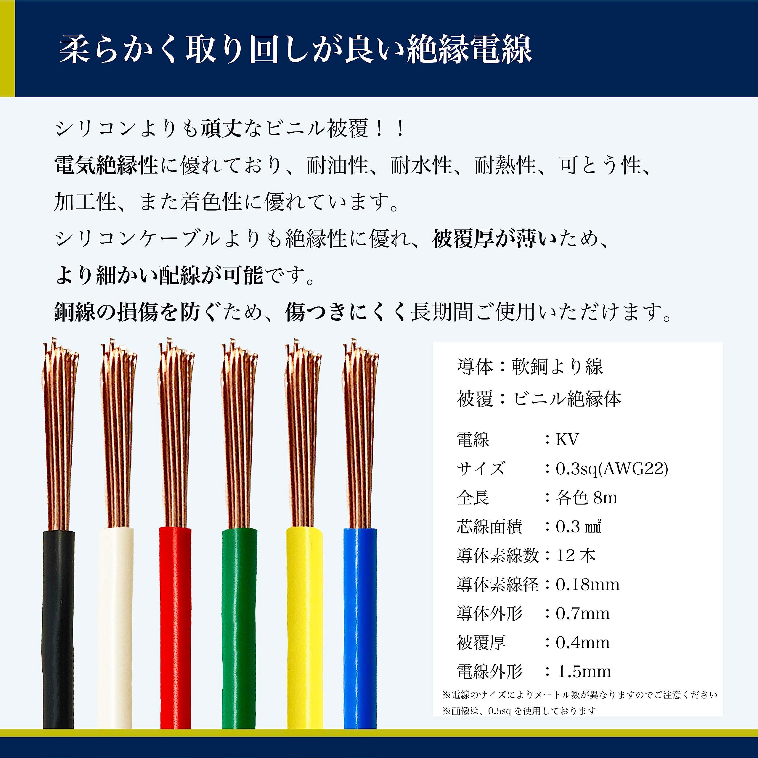 電線 ケーブル 0.3sq AWG22 黒白赤緑黄青 6色セット 8m 100Vケーブル 銅線 配線 コード 絶縁電線 通信機器用ビニル電線 電子機器用 内部配線 DIY 車 バイク 0.3㎟ 箱無し 詰め替えセット KVケーブル 電線のみ