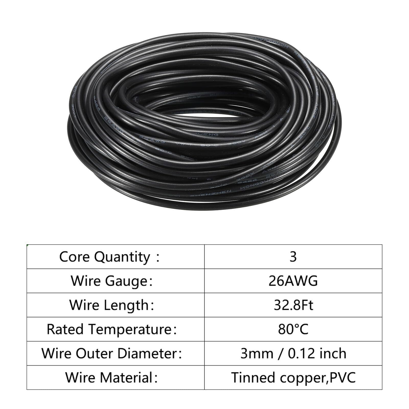 uxcell 電線ケーブル 26A WG電線 3芯 UL2464 LED電源照明ケーブル 錫メッキ銅 10M 低電圧 PVCケース 配線 絶縁 延長電源コード 交換 修理 リード線 LEDストリップランプ照明用 黒