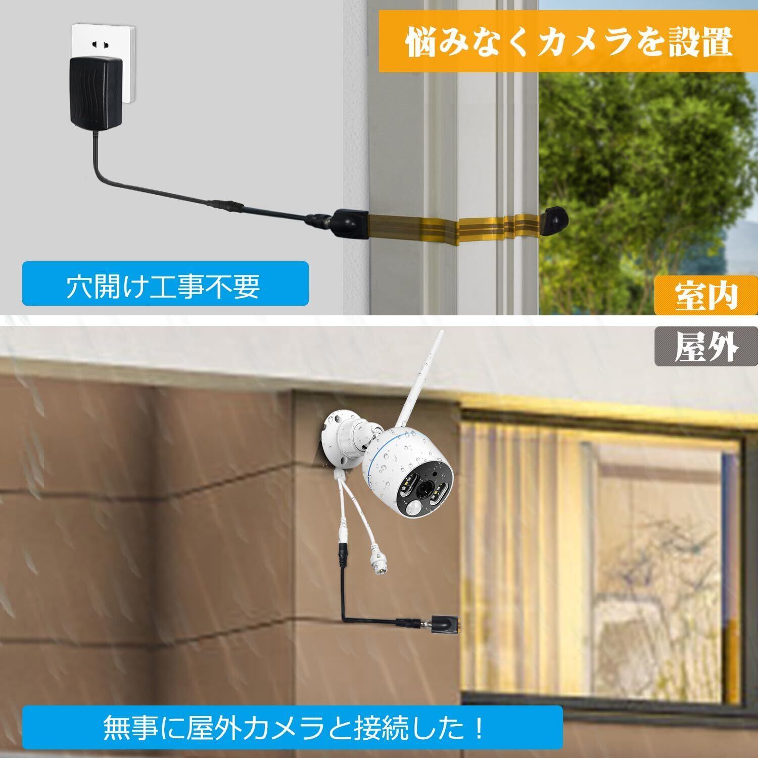 . 工事不要で簡単設置! 0.25mm超薄ケーブルが隙間を通す 屋外に電源コンセント不要! 厚さ0.25mmの極薄フラット設計により、サッシやドアの微細な隙間(約0.3mm以上)を通過可能。穴あけ工事ゼロで屋内から屋外カメラに給電でき、賃貸住宅でも設置可能です。