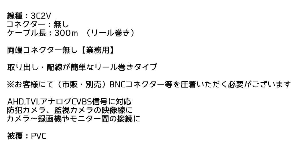 線種:3C2V 300m リール巻(コネクター無) AHD,TVI,アナログCVBS信号に対応 防犯カメラ、監視カメラの映像線に カメラ〜録画機やモニター間の接続に 被覆:PVC