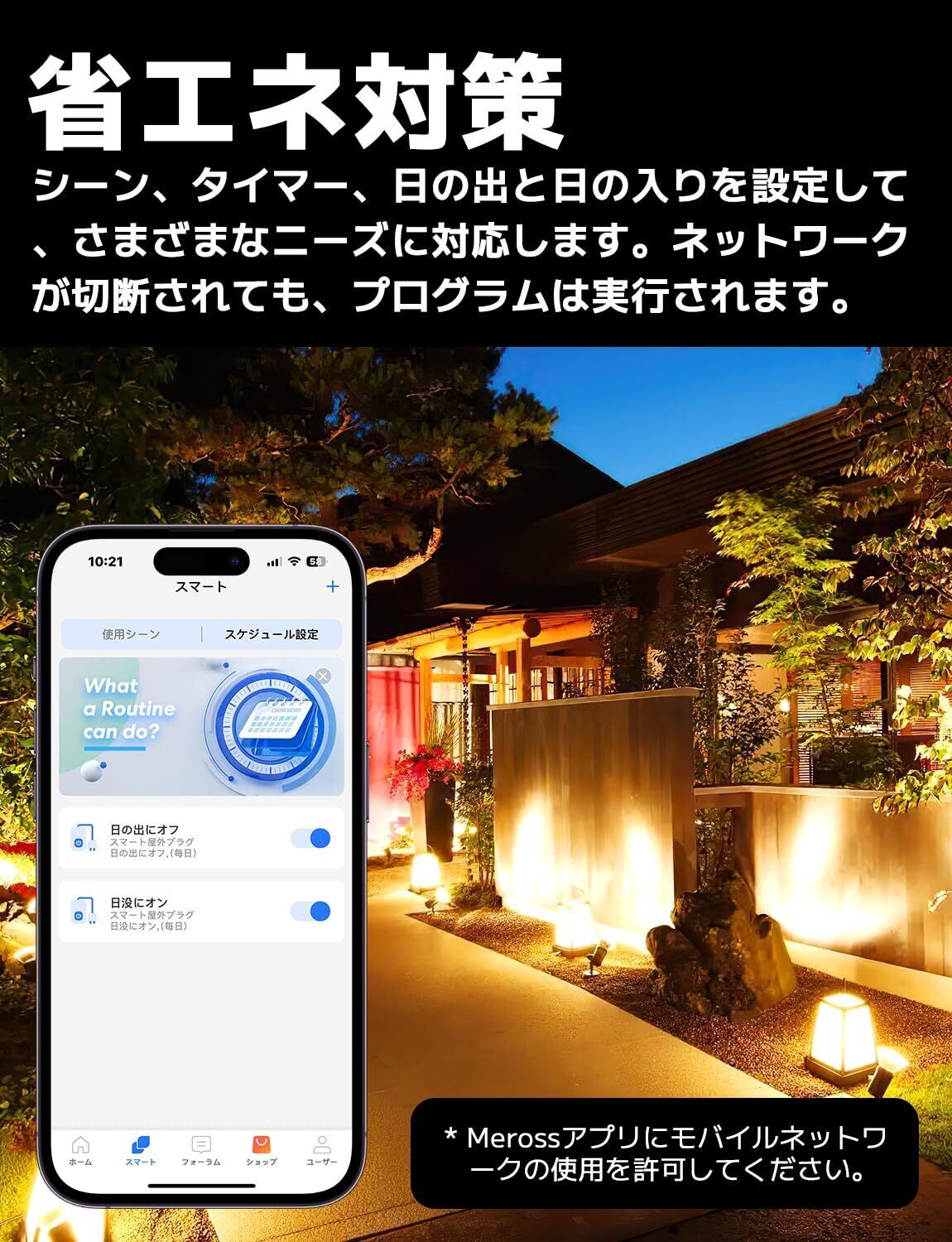 【タイマー機能・より節電で気楽に】Meross スマート屋外プラグのタイマー機能を使えば、スケジュールに応じてコンセントのオンオフ時間を設定できます。これにより、無駄な電力を節約し、電気料金を抑えることができます。また、日の出と日の入りに合わせて自動的にオンオフを切り替えることもできます。例えば、日の出と同時にスプリンクラーをオンにして植物に水をやったり、日の入りと同時に庭の街灯をオンにしたりすることで、より賢く節電することができます。
