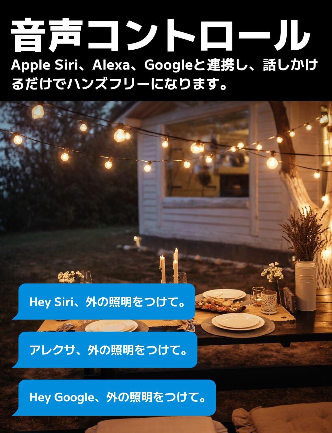 【音声コントロール・よりスマートに】Meross スマート Wi-Fi 屋外プラグは、Apple HomeKit(iOS 13以降)、Alexa、Google Assistant に対応しています。コンセントをスマートフォンアプリに接続すれば、音声でデバイスを操作することができます。例えば、「Hey Siri、ライトをつけて」と話しかけるだけで、ライトが自動的に点灯し、より便利でスマートな生活を実現できます。