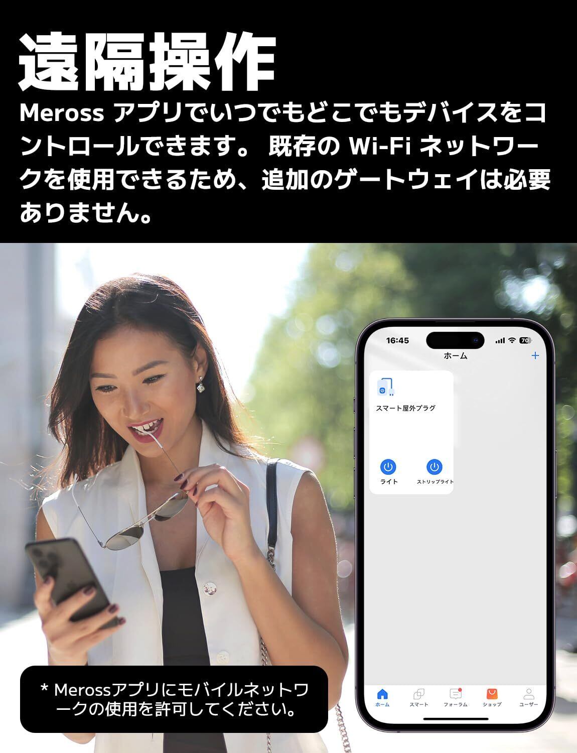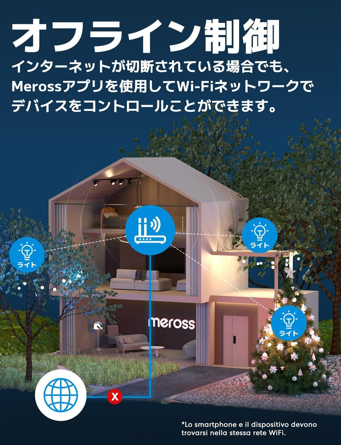 【オフライン作業・ミリ秒単位の反応】ルーターがインターネットから切断されている場合でも、Meross Wi-Fi屋外プラグはスマホと同じ Wi-Fi ネットワークに接続されている限り、接続されたデバイスを Meross アプリを通じて制御できます。そしてWiFi接続範囲が長いため、オフライン率が低く、ミリ秒単位のレスポンスと超高速のローカルコントロールが可能です。