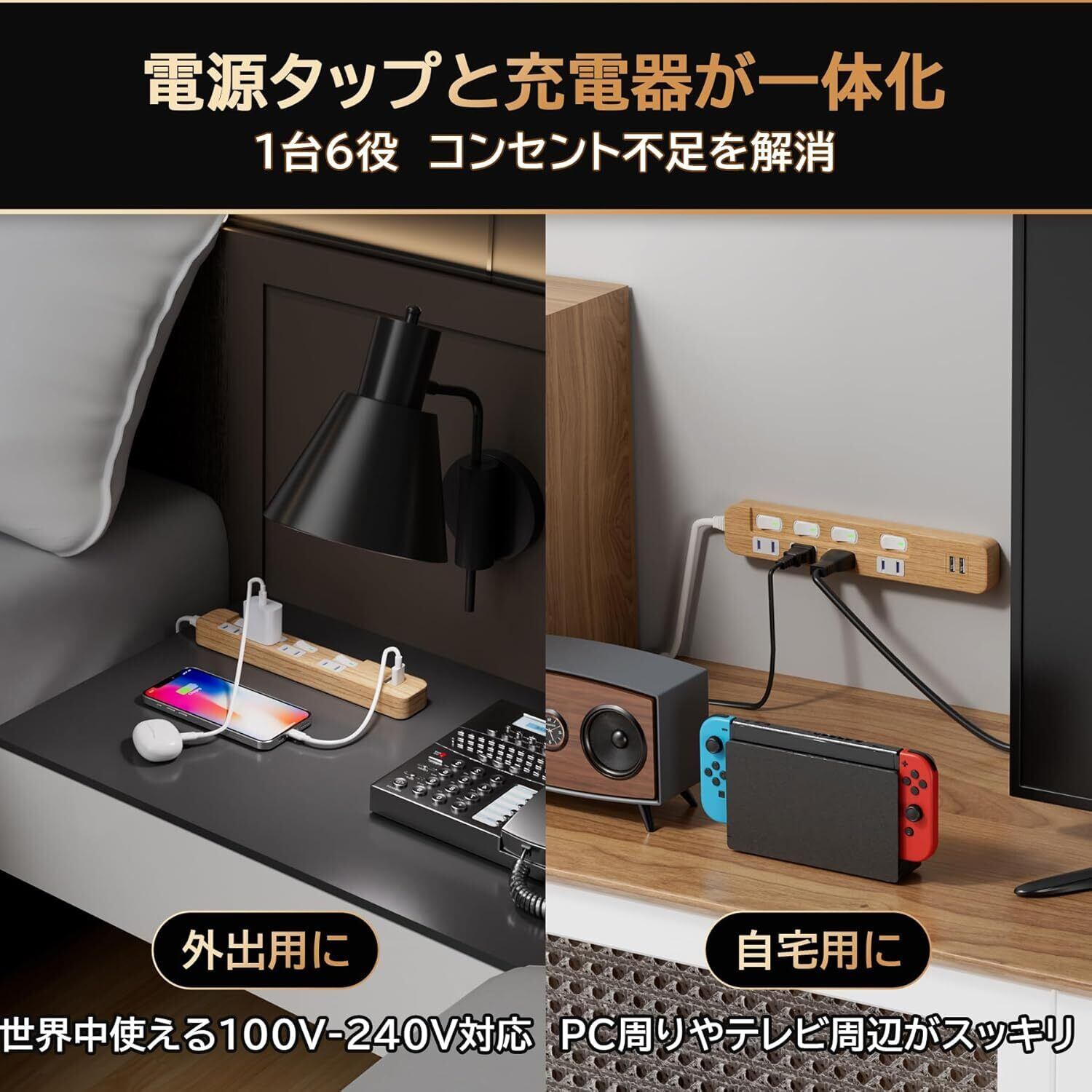 「シンプルなデザイン全6ポート」電源タップと充電器が一体化しているので、スリムなのにポート数が豊富。4コンセント+2USB同時使用可能。ブラックは落ち着いたお部屋に、木目調は洋風・和風どちらのお部屋にも馴染みます。カラーを選んで毎日使う場所に、お気に入りを。
