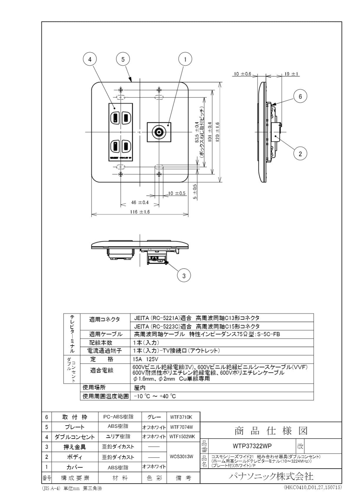 パナソニック(Panasonic) コスモシリーズワイド21 組み合わせ器具 (ダブルコンセント)(ホーム用高シールドテレビターミナル <10~3224MHz>)(プレート付)(ホワイト) WTP37322WP