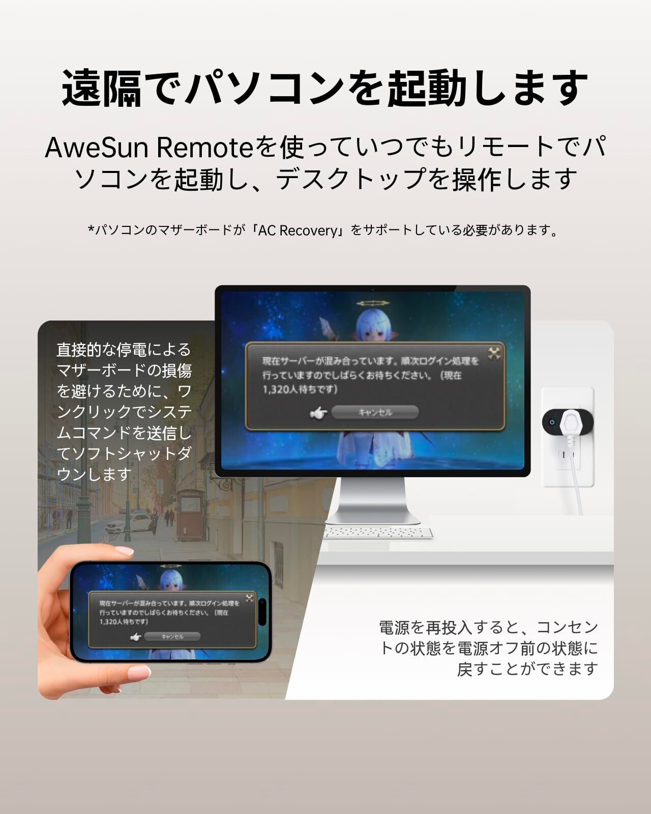 【AweSun Remoteスイッチコンピュータ+遠隔制御机器リモートオフィス、ゲーム一体化】AweSun Remote ソフトウェアと組み合わせると、いつでもどこでもコンピュータの電源をリモートでオンにすることができ、システム コマンドを送信してソフト シャットダウンして、直接的な停電によるデータ損失やマザーボードへの損傷を回避できます。 同時に、AweSun Remote を使用すると、いつでも携帯電話、タブレット、またはコンピュータを通じて自宅やオフィスのコンピュータをリモート制御したり、リモート オフィスのニーズを満たすためにリモートでファイルを転送したり、リモートでファイルを印刷したりすることができます。旅行中や仕事中でも、いつでもどこでもゲームをプレイすることもできます。 ゲームの新しいシーズン中は、事前にダウンロードまたはアップデートして、サーバーに入るために列に並んで、家に帰ったらすぐにゲームをプレイする方が効率的です。 高度なゲーム バージョンでは、いつでも携帯電話でゲーム キーを直接カスタマイズし、リモートからコンピュータ ゲームをプレイできます。