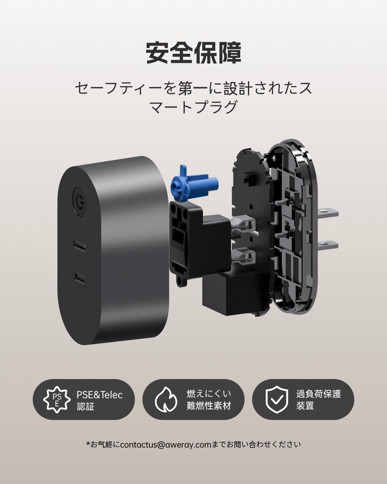 【品質安全& 24時間ブランドのアフターサービス】あなたの使用の安全性は私達の最も重要な任務です。AweRayスマートプラグは、安全性を第一に設計されており、「過負荷保護装置」、「PSE/TELEC認証」、「高温難燃材」の3つの機能を備え、使用の安全性を高め、子供の感電を心配する必要もありません。のスマートコンセントは1年を受けています。また、のスマートコンセント、AweSun Remoteソフトウェアをご利用中に問題があれば、24時間以内に速やかにお返事いたします。
