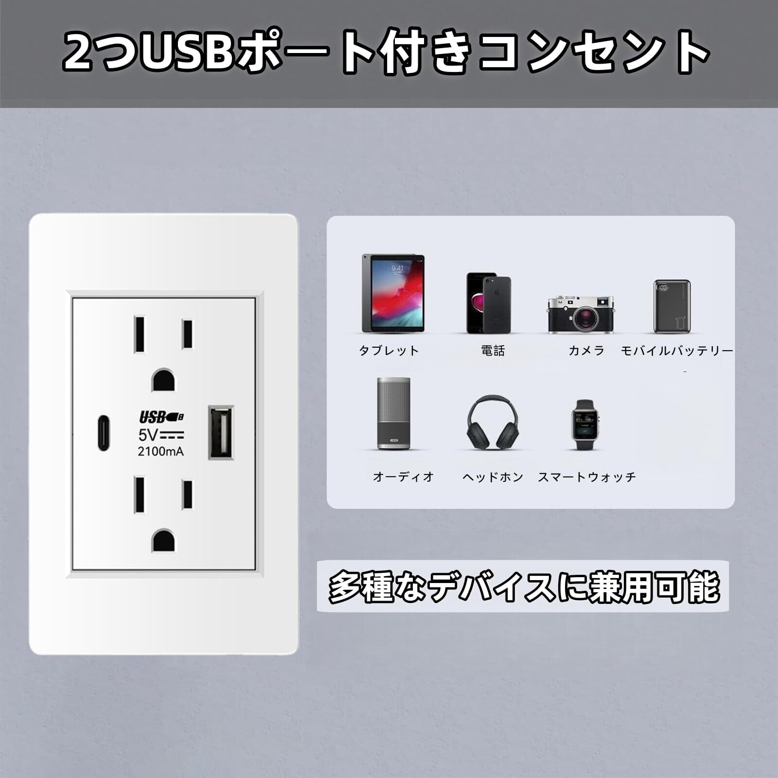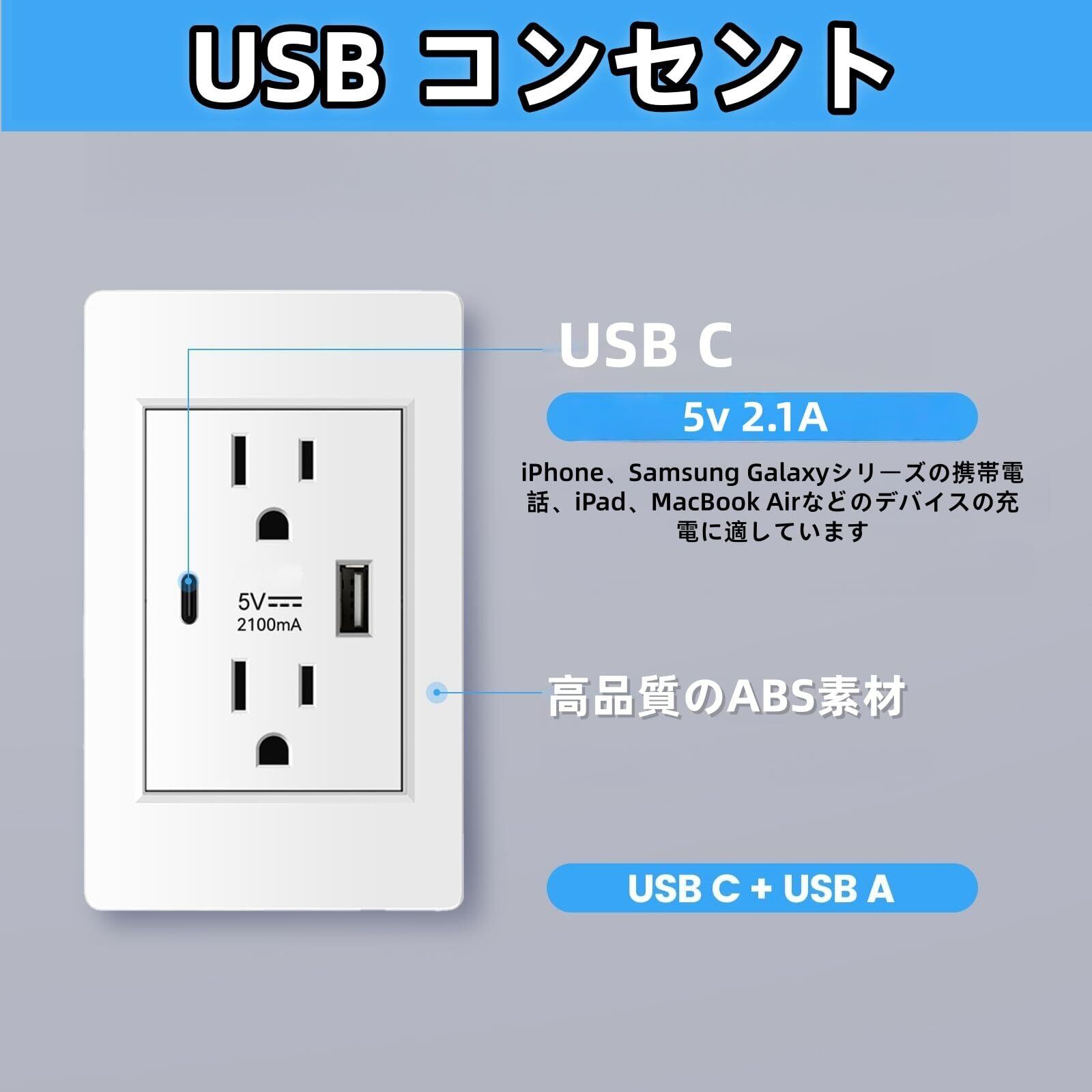埋め込みコンセント コンセント 2ポート USB&Typc-C 壁面用コンセント 複数保護 USBソケット 取り付けに簡単 AC 110‑220V 5V 2100mA 家庭 オフィス ホテル用 (ホワイト)