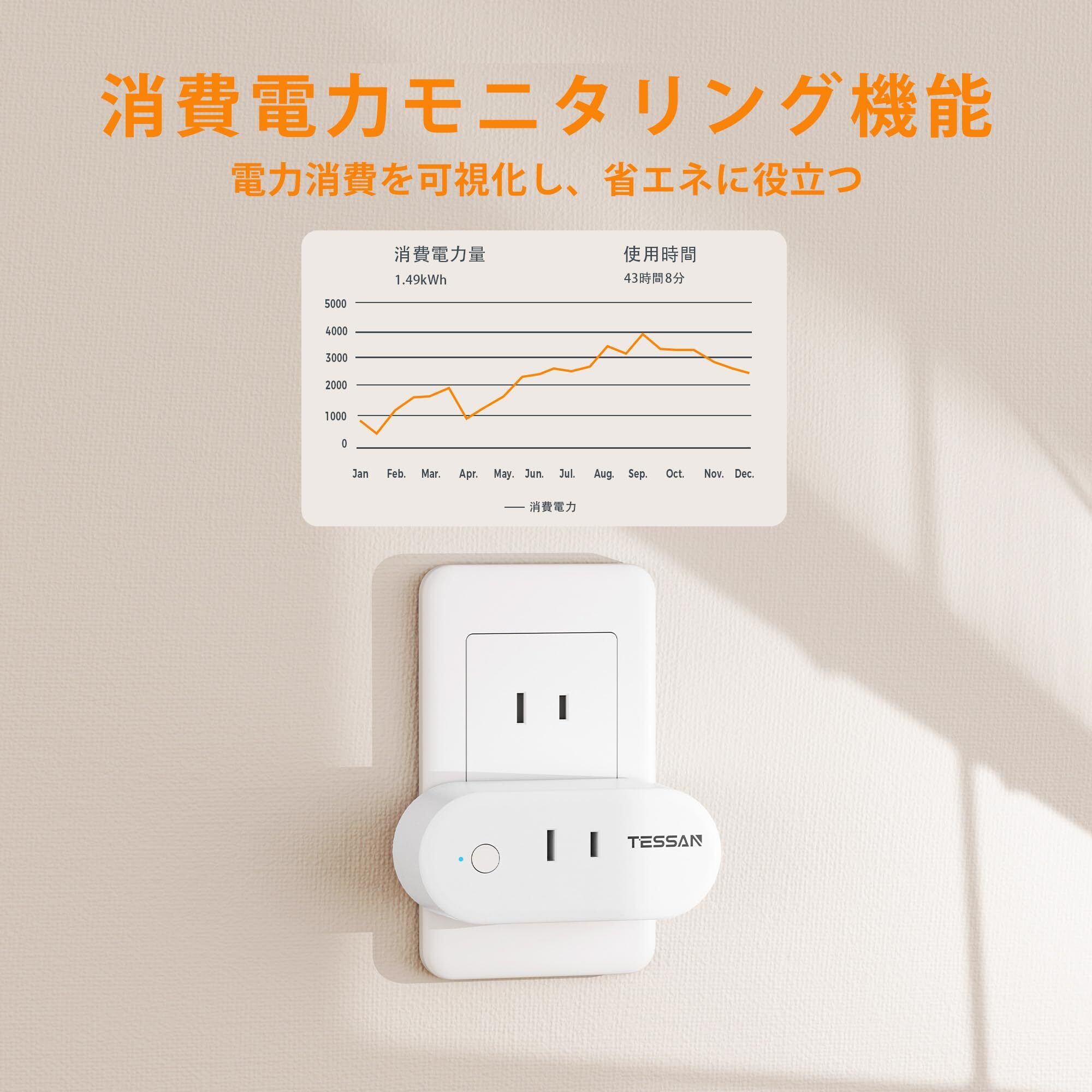 【限定セール】スマートプラグ WiFi TESSAN タイマー ミニ スマートコンセント 消費電力モニター コンセント 節電·省エネ スケジュール 電源タイマー 遠隔操作 アレクサ/Google ホーム 対応 音声コントロール