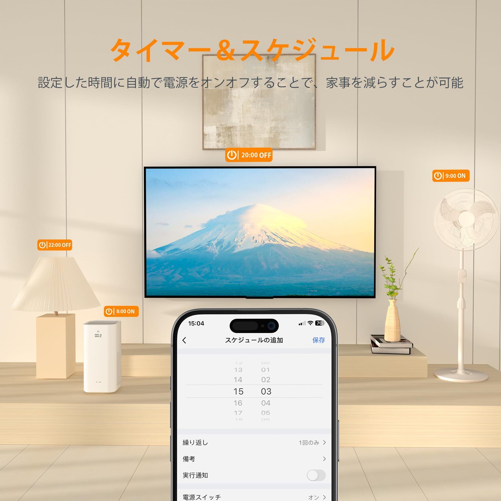 このスマート電源タップはタイマーとスケジュール機能があるので、指定した時刻に自動にオン/オフ切り替えることも可能です。タイマー付きコンセントはお手軽・簡単に電気代を節約できます。