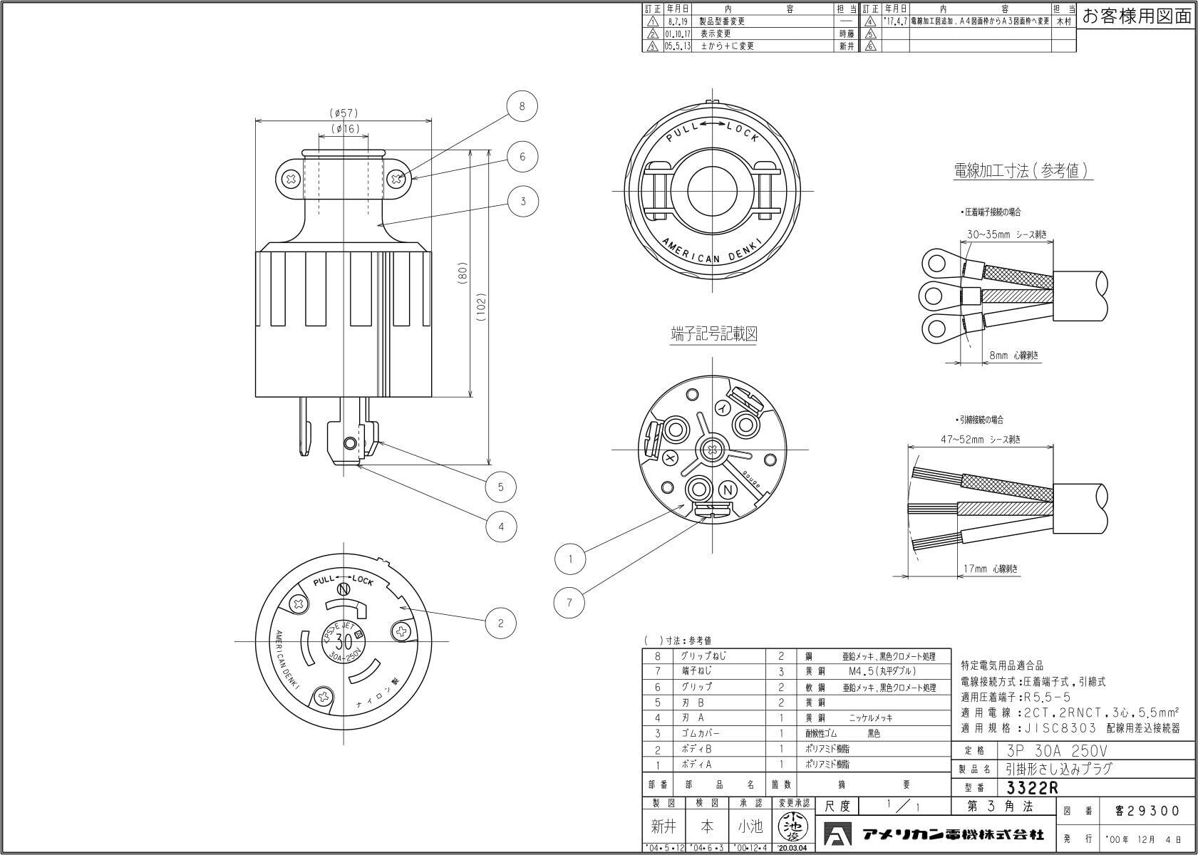 アメリカン電機 引掛形 ゴムプラグ 3P30A250V 3322R