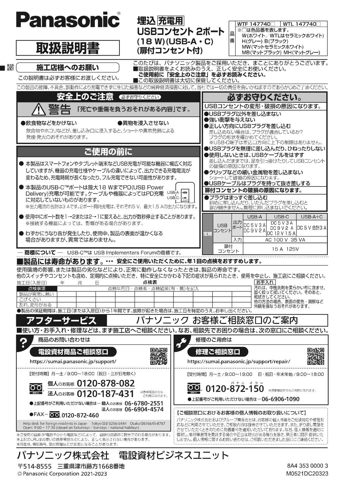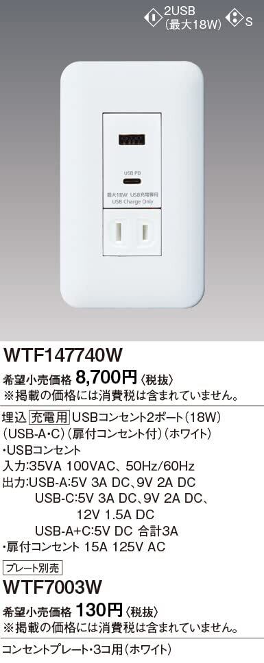 パナソニック(Panasonic) コスモシリーズワイド21 埋込充電用USBコンセント2ポート 18W USB-A・C 扉付コンセント付 ホワイト WTF147740W