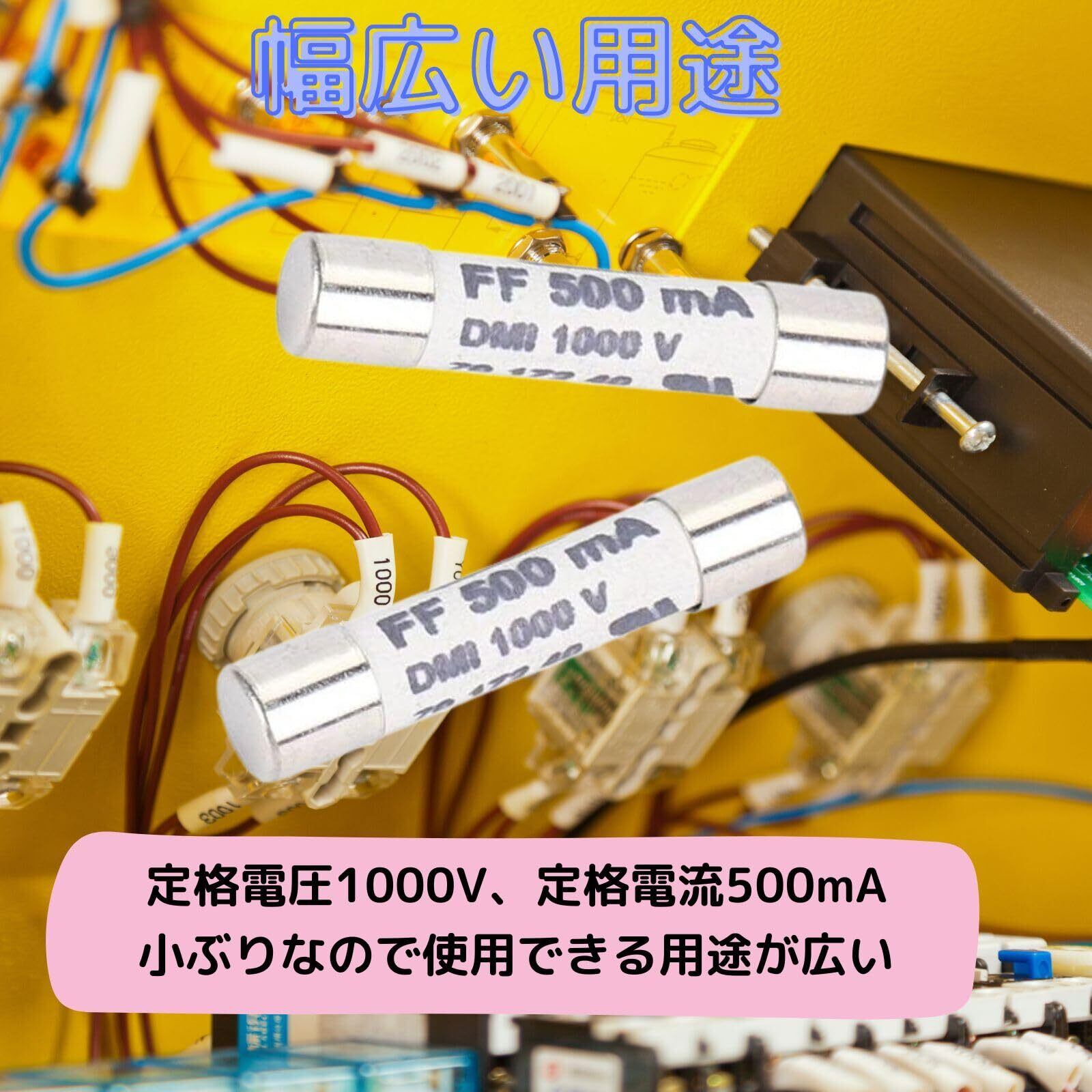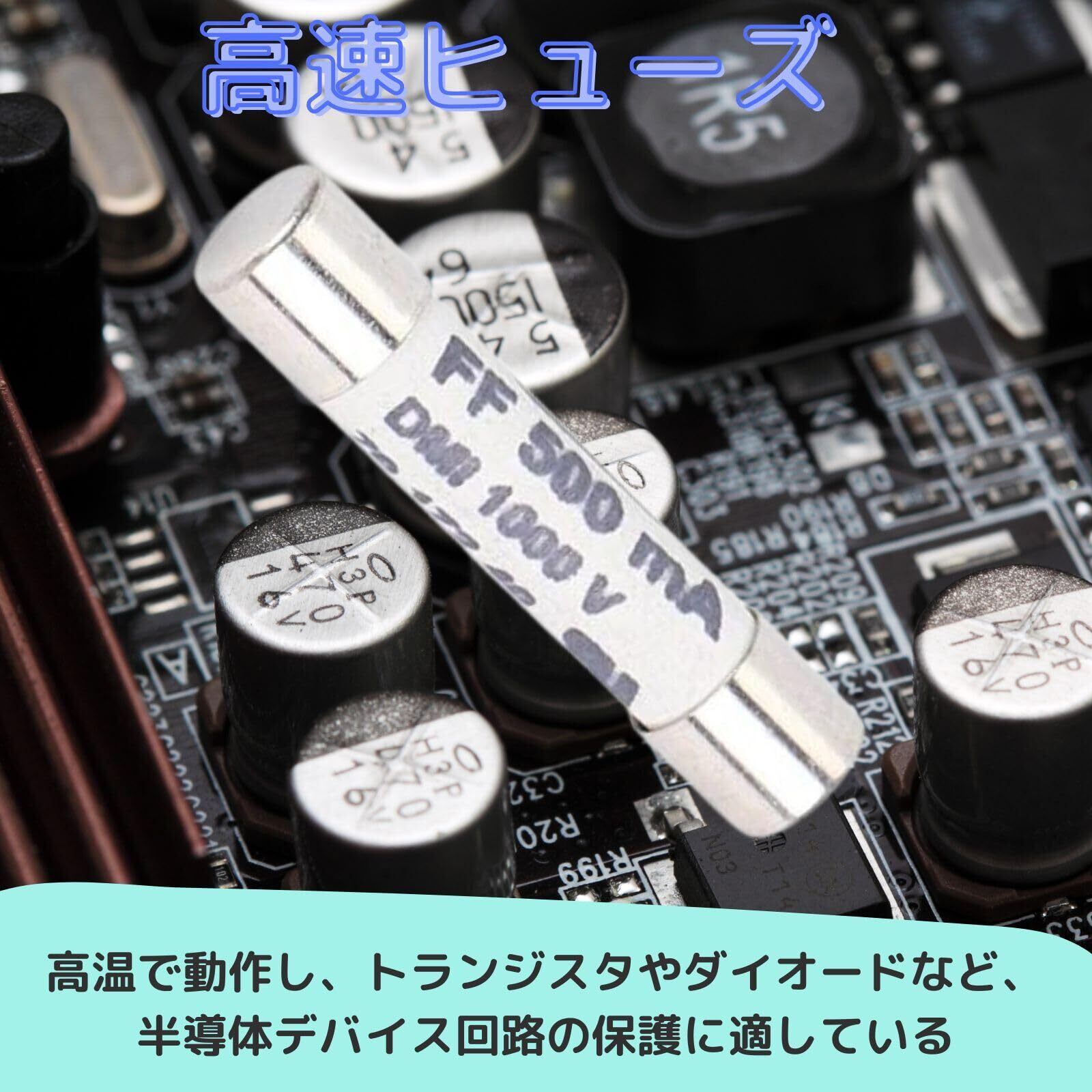 【コンパクトで幅広い用途】定格電流約500mA、定格電圧約1000Vで、コンパクトなサイズ(全長約32mm、直径約6.3mm)なので、幅広い用途にお使いいただけます。このセラミックヒューズは高速ヒューズです。このヒューズは高温で動作するため、トランジスタやダイオードなどの半導体デバイスの回路を保護するのに適しております。