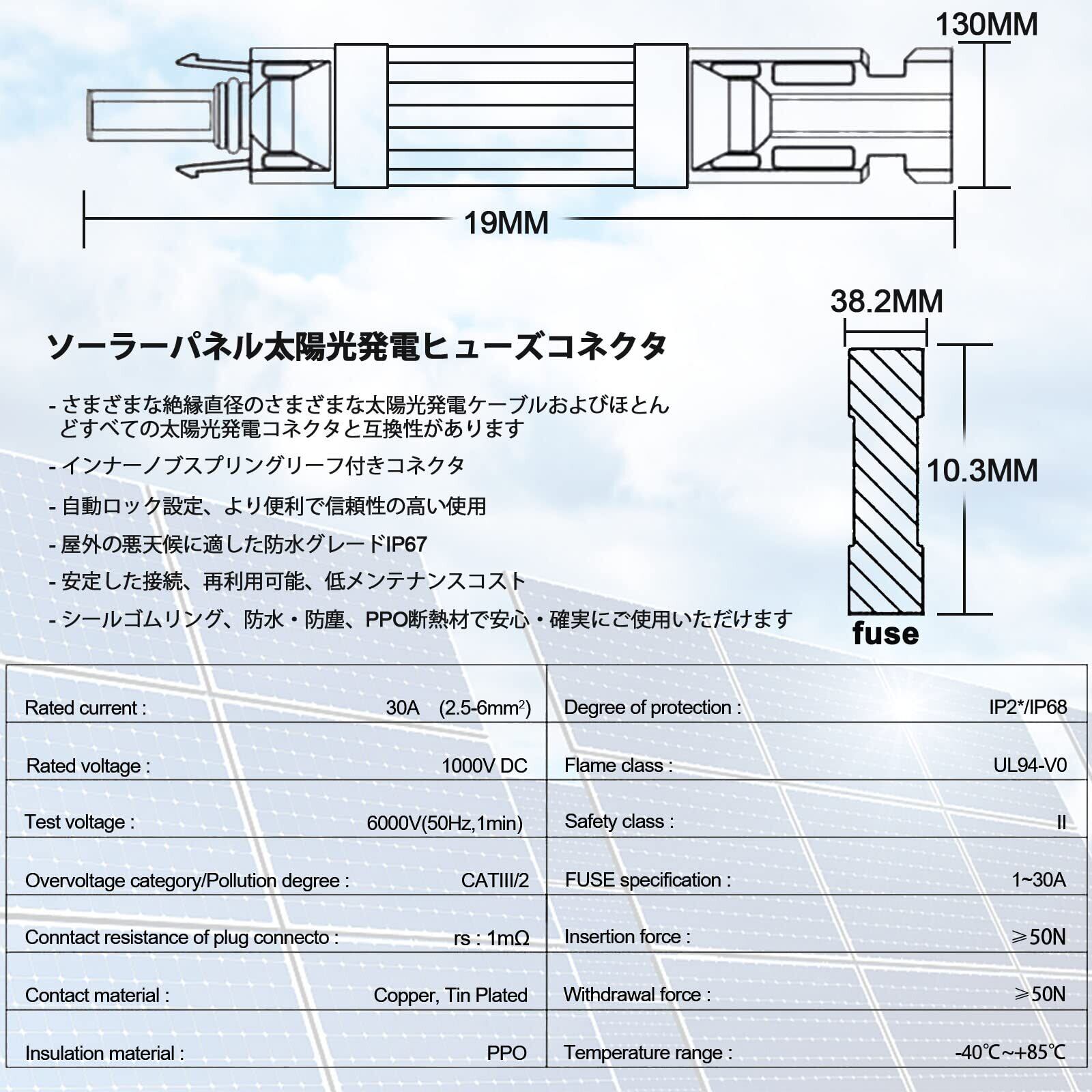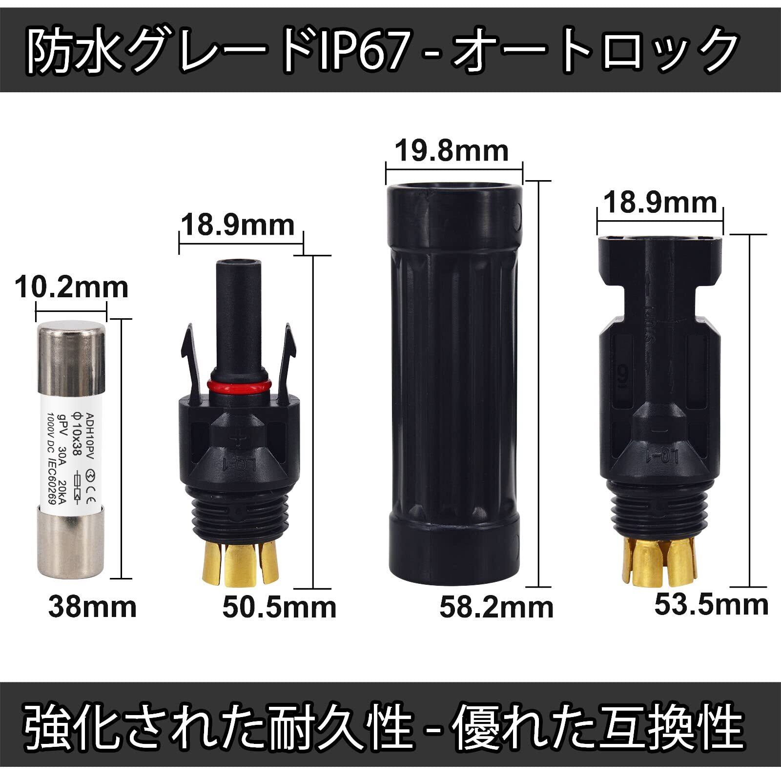 【交換可能なヒューズ】サイズが10 * 38mmのさまざまなヒューズに対応しており、破損した場合は簡単に交換できます。ソーラーアレイに完全な単一回路保護を提供し、大電流によるソーラーパネルの損傷を防ぎます。負荷がかかっている状態でコネクタを接続/切断しないでください。