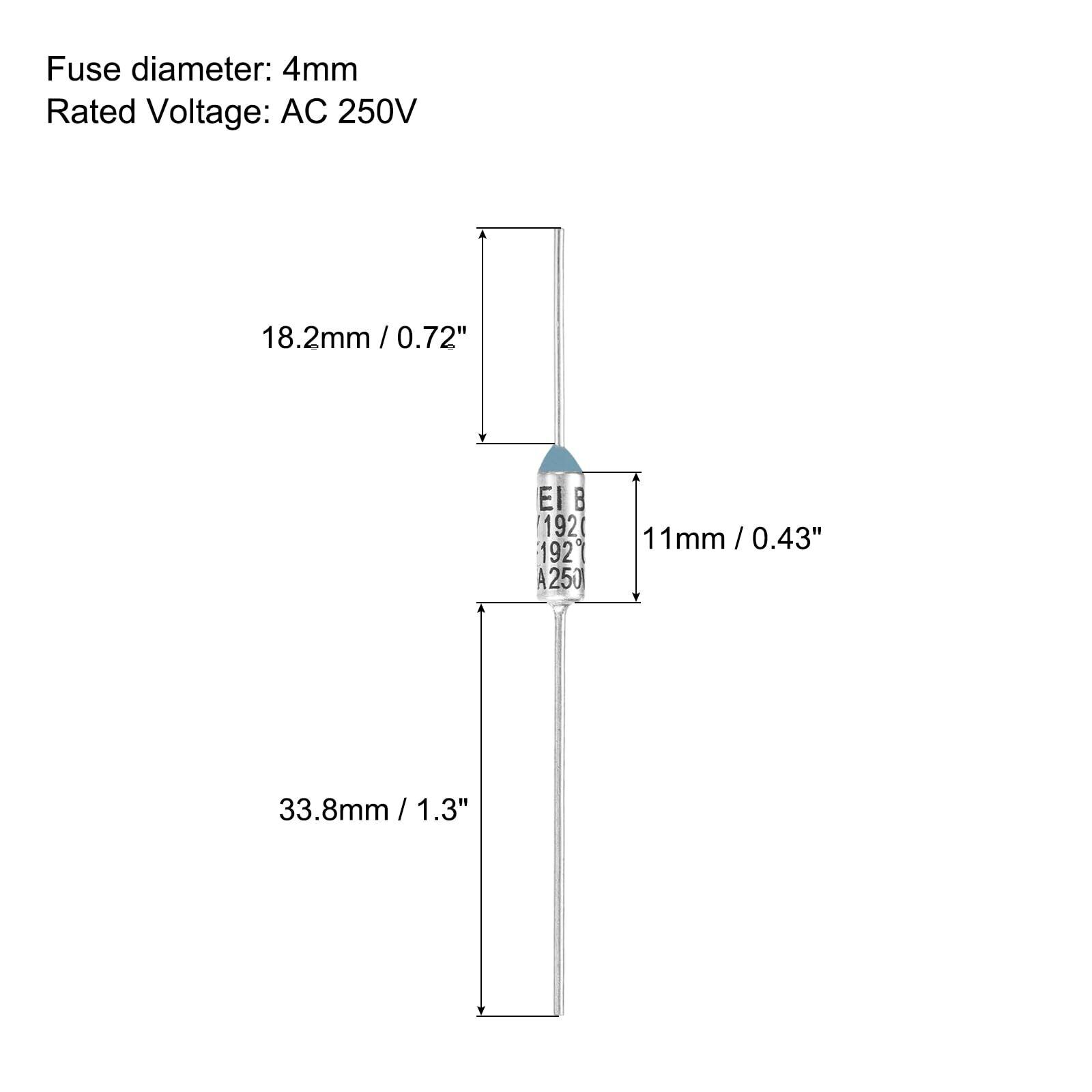 定格電圧:AC 250V;定格電流:10A;カラー:シルバートーン;ヒューズサイズ(直径×長さ):4x11mm/0.16x0.43";定格溶断温度:192°C(377.6°F);パッケージに含まれるもの:金属温度サーマルヒューズ6個;