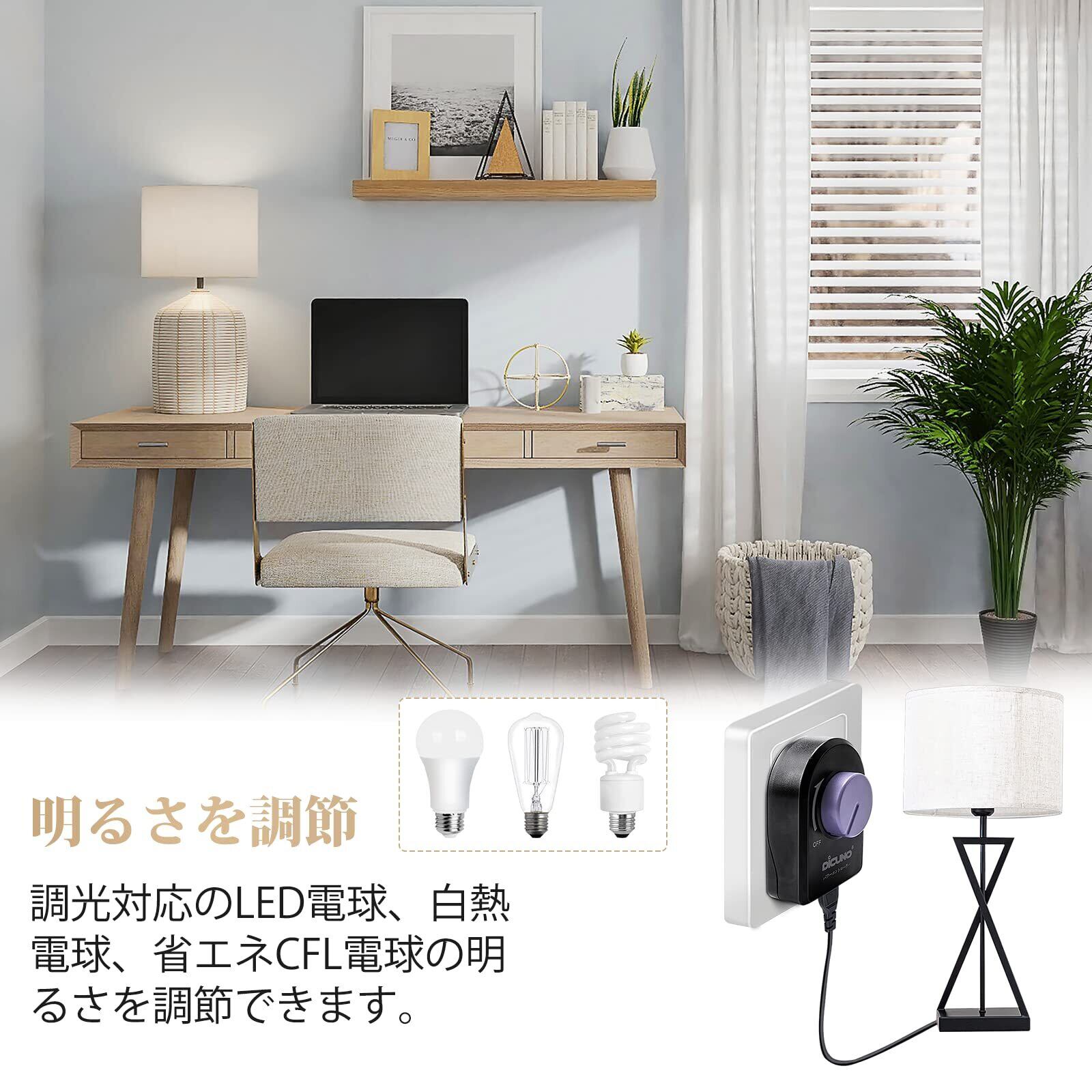 【手元で調節】ご使用の機器のプラグを差し込み、コンセントにつなぐだけの簡単取り付けです。あとは調整つまみを動かして調節します。