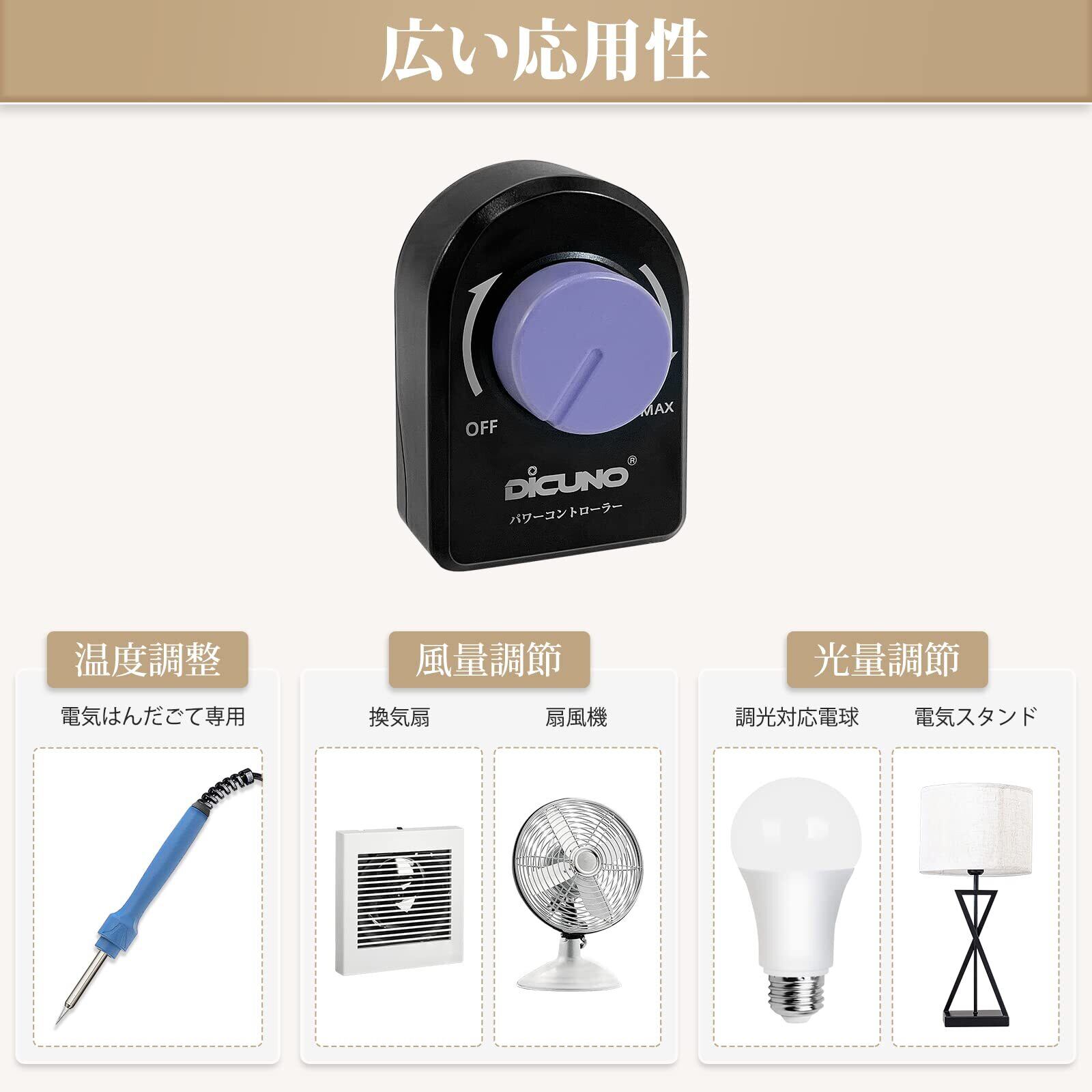 【在庫限り】DiCUNO パワーコントローラー 光量調節 スピードコントローラー 温度調整 電気はんだごて 風量調節 扇風機 使用範囲200W以下 AC100V 調光スイッチ(LED電球 、CFL 、白熱灯) 黒い 1個入